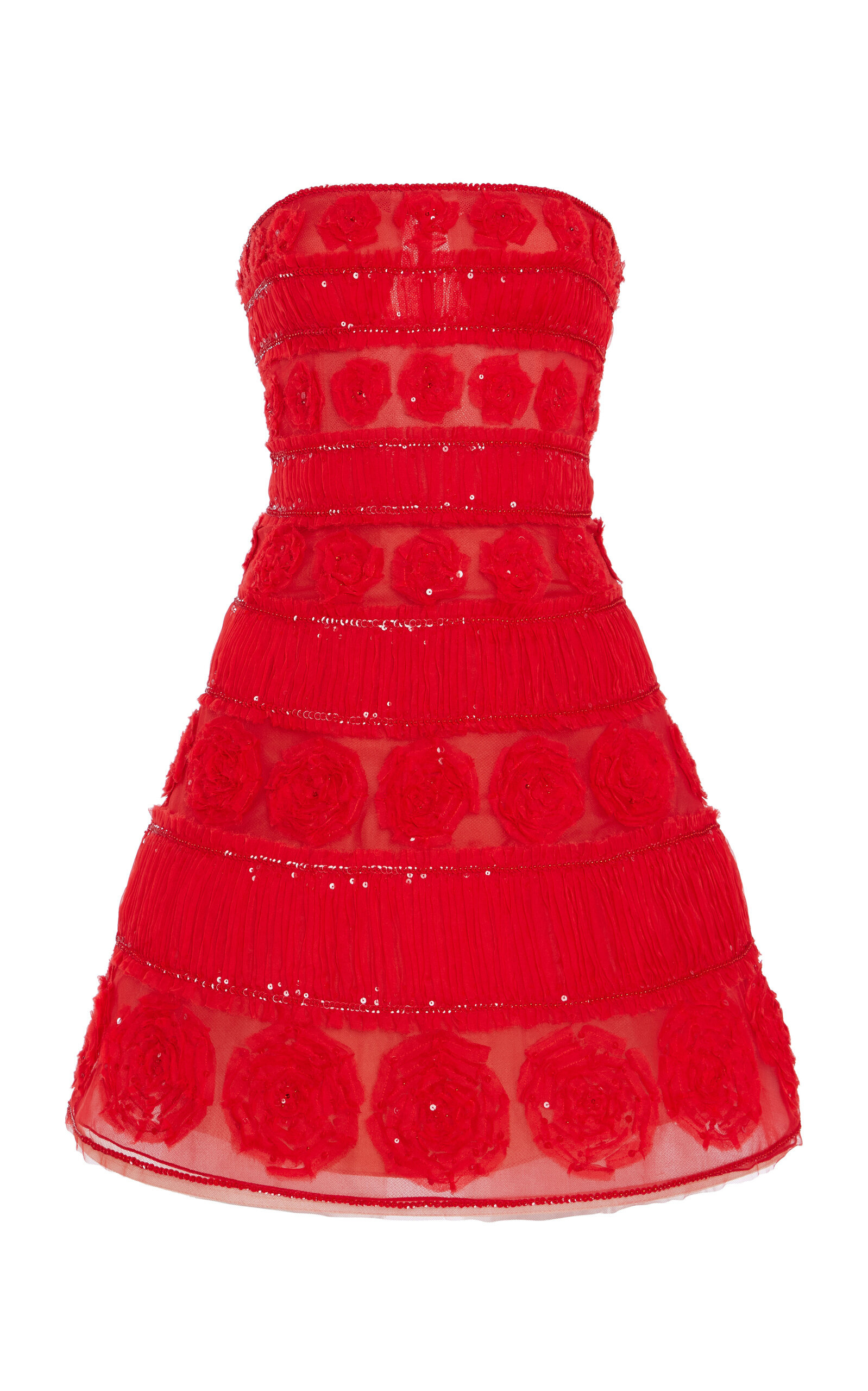 PRODUCT DETAILS - Strapless, A-line shape, embellished, mini hem - Concealed zip fastening - Unlined - Composition: 100% Polyamide - Color: Scarlet - Dry clean only - Pre-Fall '25