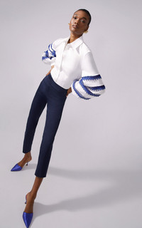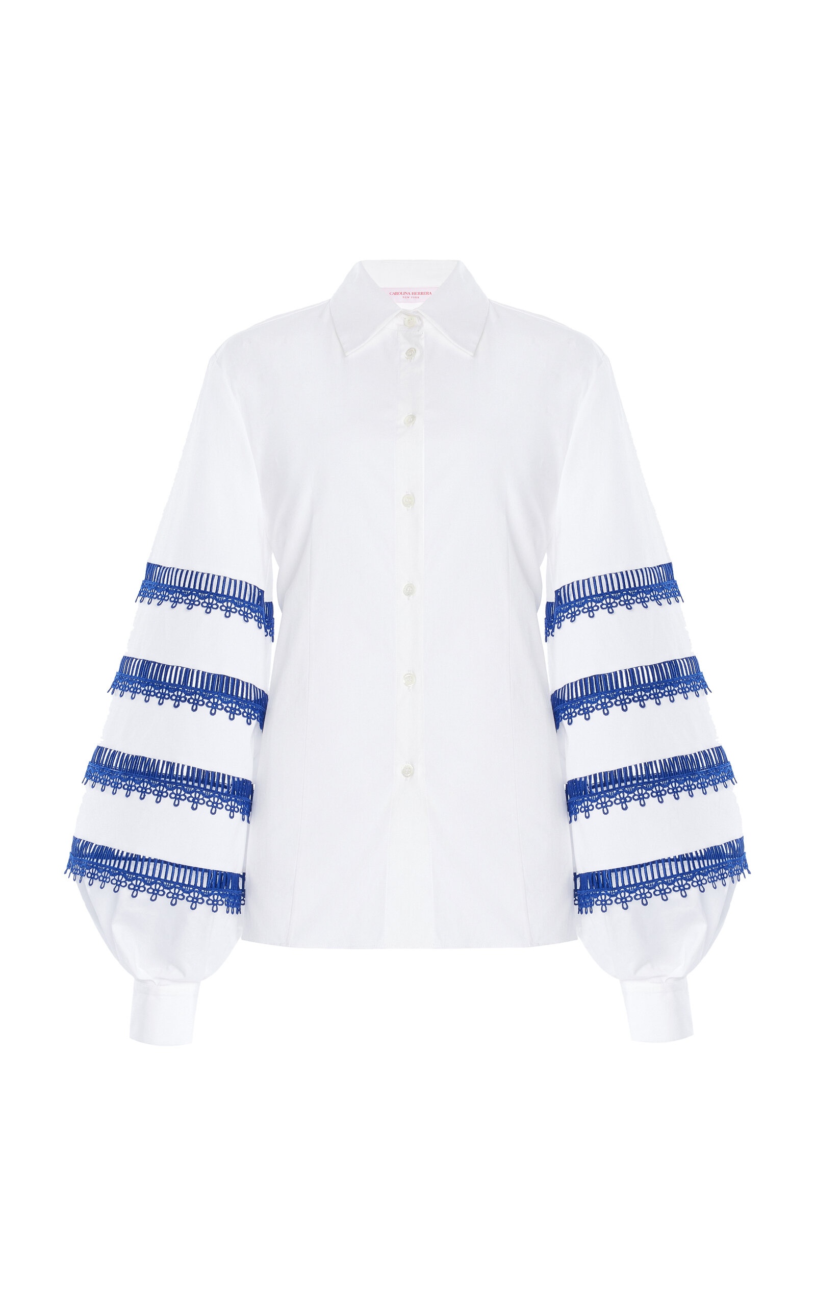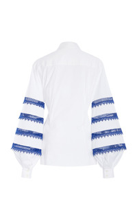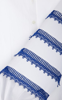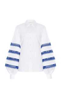PRODUCT DETAILS - Fluted sleeves, embroidered trim in a tiered design, fitted button-down - Button fastening through front - Unlined - Composition: 97% Cotton, 3% Polyurethane - Color: White Multi - Dry clean - Cabana '25
