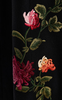 PRODUCT DETAILS - Long sleeve, flared shape, floral embroidery, long length - Button fastening through front - Composition: 100% Virgin Wool - Color: Black Multi - Dry clean - Made In: United States of America - R26 Chalet