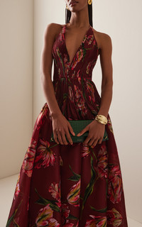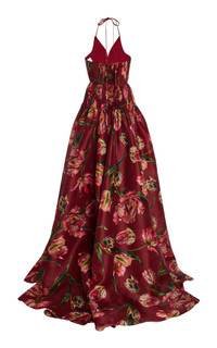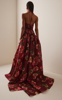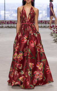 PRODUCT DETAILS - Fall '25 - Slim fit, thin halter straps, plunging V-neck, pleated bodice, full A-line skirt with train - Zipper fastening - Composition: 100% Silk - Color: Garnet Multi - Dry clean - Made in the USA
