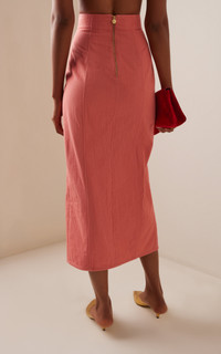 Inspired by the “self-assured” Carolina Herrera woman, Wes Gordon continues to reinterpret—yet still honor—the house’s iconic codes reimagining signatures with fresh whimsy. This midi skirt is made from cotton-blend twill with a denim handfeel and ulta-high waist — perfect for accessorizing with a statement belt. PRODUCT DETAILS - Resort '26 - Zip fastening along back - Composition: 58 Cotton, 42% Polyester - Designer color: Sunset - Dry clean only - Made in Italy SIZE & FIT - Designed for a slim fit