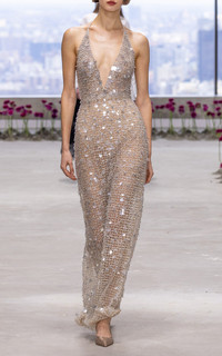 PRODUCT DETAILS - Fall '25 - Slim fit, sleeveless, shoulder straps, plunging halter neck, paillette embellishments - Zipper fastening - Lined - Composition: 100% Polyamide - Color: Nude - Dry clean - Imported