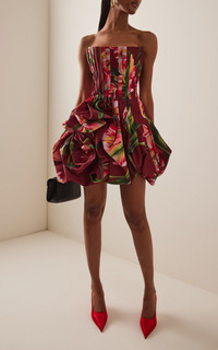 PRODUCT DETAILS - Fall '25 - Slim fit, strapless, pleated bodice, draped skirt - Zipper fastening - Composition: 100% Polyester - Color: Garnet Multi - Dry clean - Made in the USA