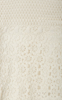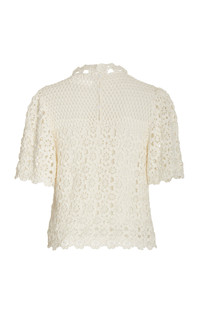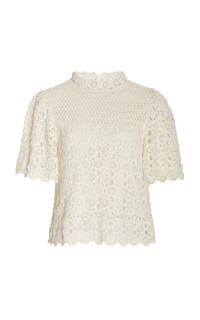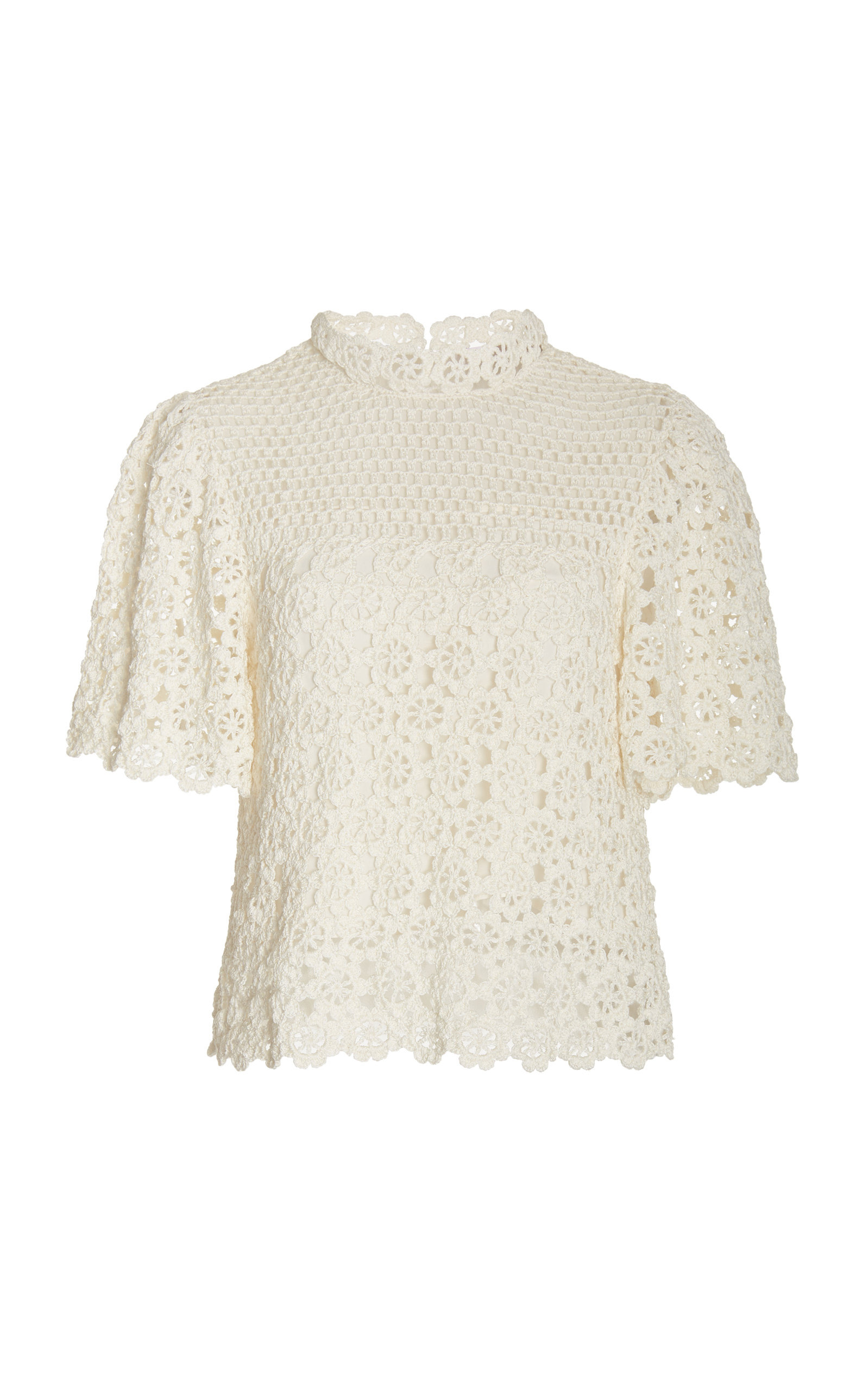 PRODUCT DETAILS - As featured in the Pre-Fall '22 lookbook, style yours with everything from tailored skirts to casual denim - Slim fit, round neck, short sleeves, scalloped edges, crocheted, unlined - Slips on - This style fits true to size, we suggest taking your normal size - Composition: 100% silk - Dry clean - Imported SIZE & FIT - Model wears a tailored sample S