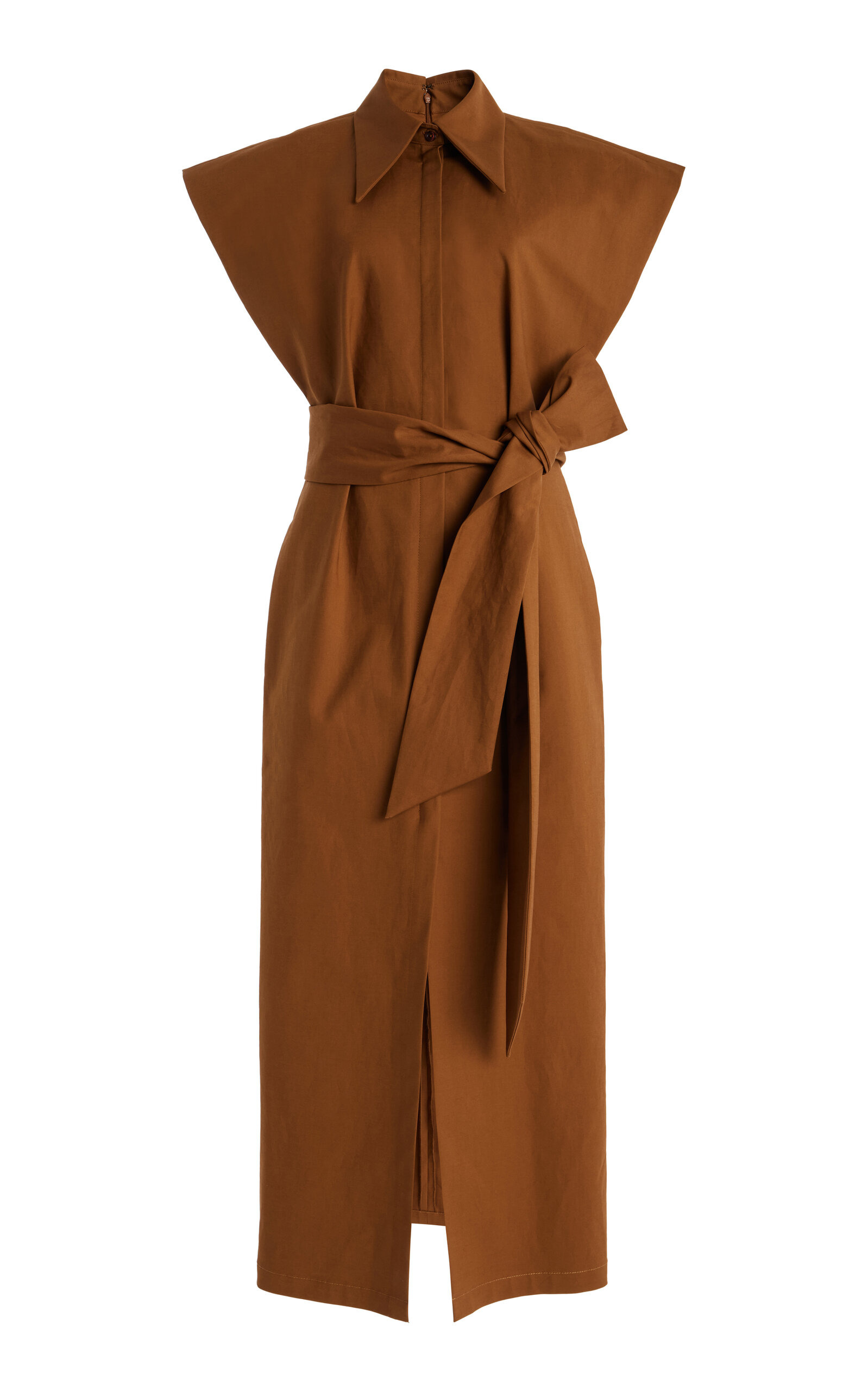PRODUCT DETAILS - Cap sleeve, collared, button-front, column shape, midi hem, comes with belt - Concealed button fastening through front - Unlined - Composition: 95% Cotton, 5% Elastane - Color: Nutmeg - Dry clean only - Pre-Fall '25