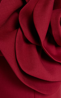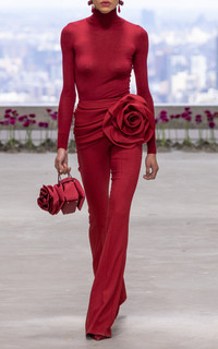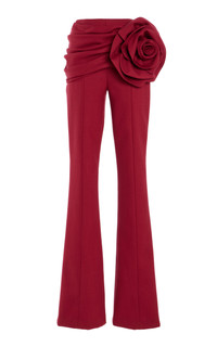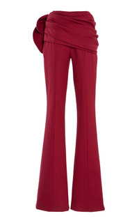 PRODUCT DETAILS - Fall '25 - Slim fit, mid rise, draped flower cummerbund at waist, bootcut leg - Zipper fastening - Composition: 97% Virgin Wool, 3% Elastane - Color: Garnet - Dry clean - Made in the USA