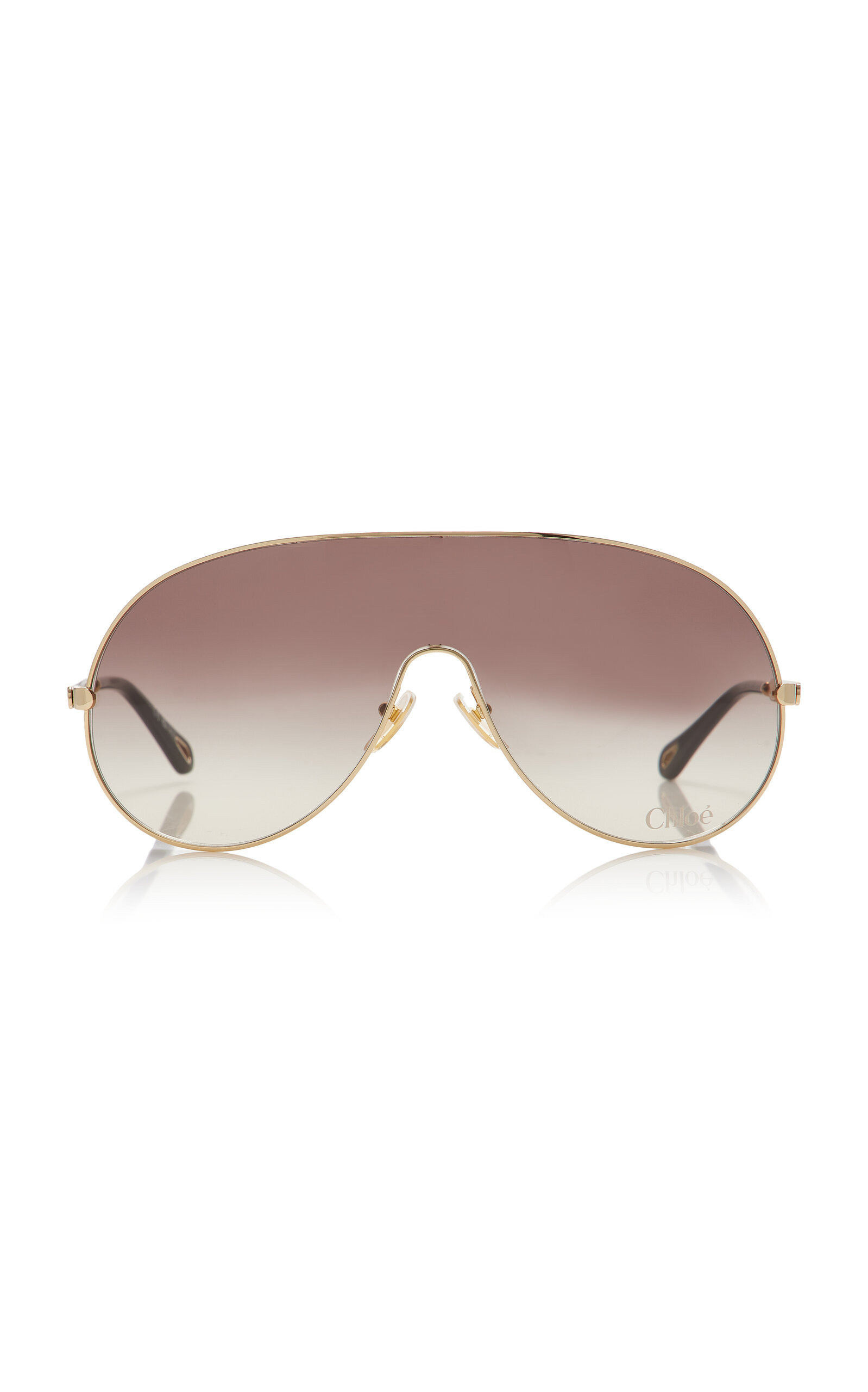 Founded in 1952, the legendary French Maison is renowned for its bohemian couture that strikes notes of youthful nostalgia and sunny nonchalance. Reinterpreting the classic aviator shape, these 'Aly' mask sunglasses pair a lightweight shiny metal frame with double gradient lenses. The Chloe logo finishes the left lens. PRODUCT DETAILS - Composition: metal - 100% UV protection - Made in Japan
