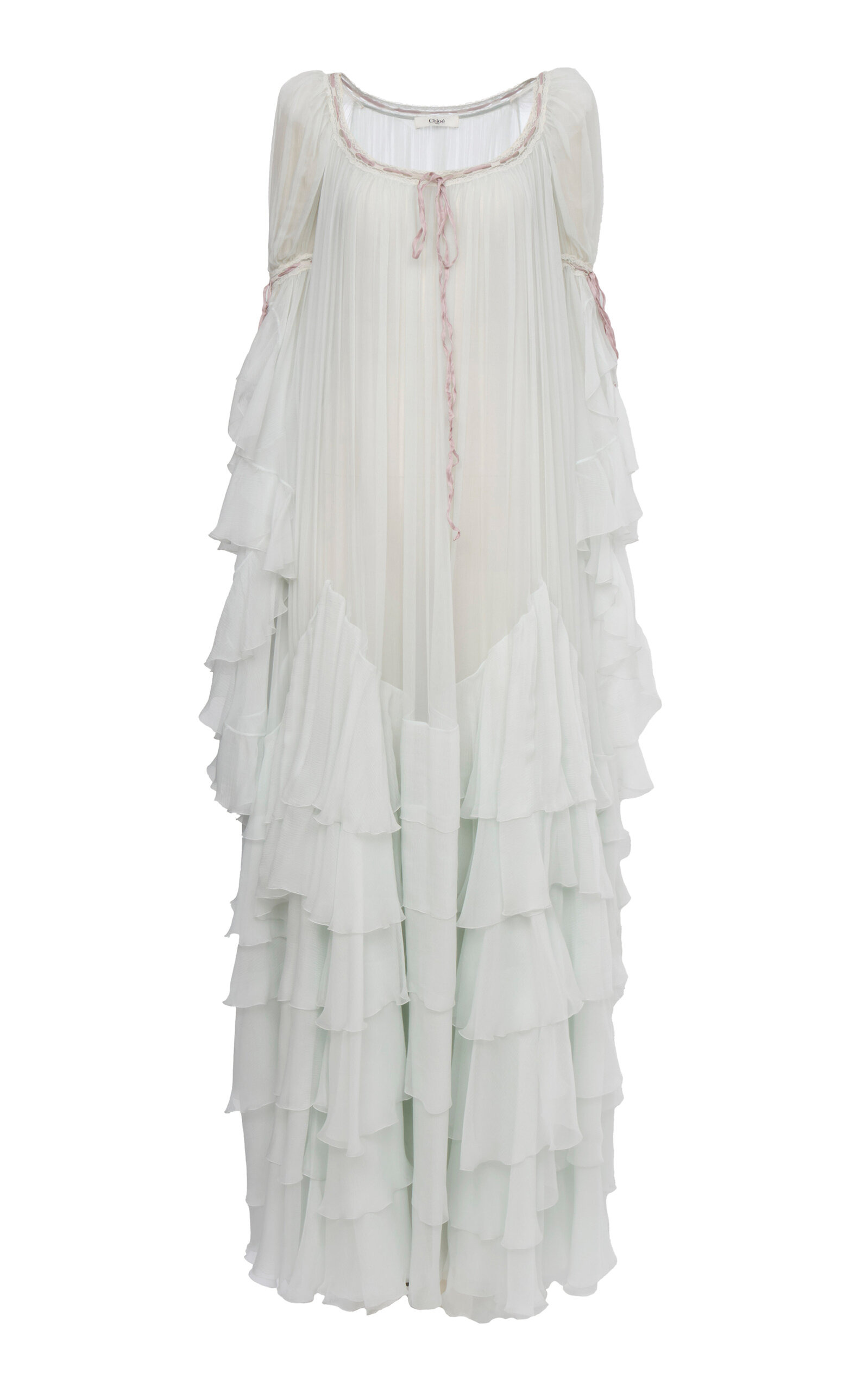 PRODUCT DETAILS - Oversized, scoop neck, tiered, ruffled, maxi hem - Concealed zip fastening - Composition: Organic Silk Mousseline - Color: Slightly Grey-001 - Dry clean only - France - Fall/Winter '25