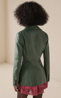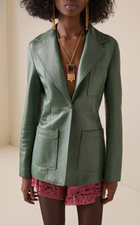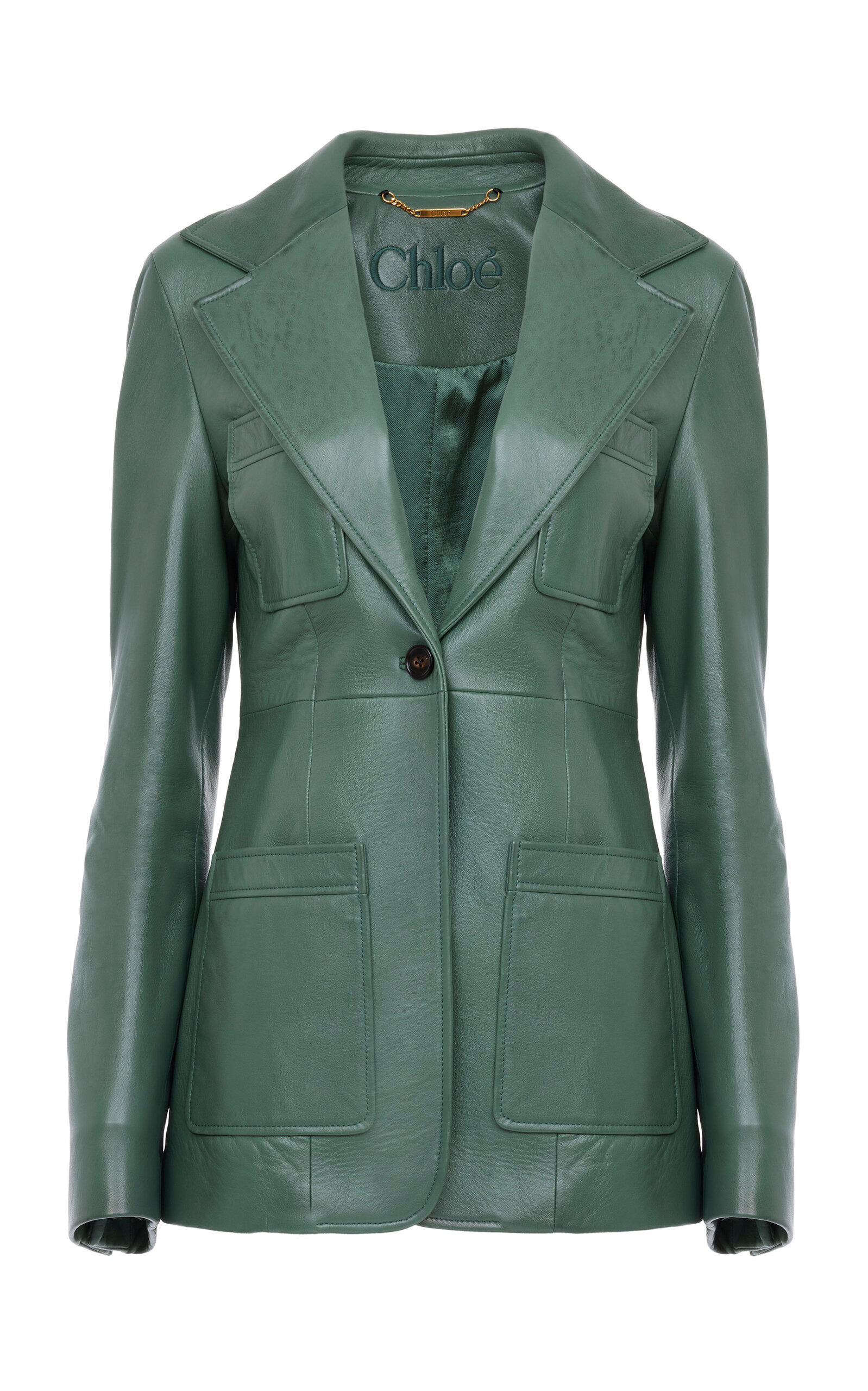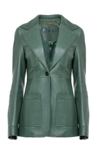 Building off Chemena Kamali's debut, the latest collection redefines Chloe’s sensual signatures with fresh ease and divine tactility. It’s a lovingly wearable ode to the enduring feminine romance of the Parisian house. This single-breasted jacket has a fitted silhouette made from buttery lambskin in a lush botanical shade. PRODUCT DETAILS - Pre-Fall '25 - Button fastening - Composition: 100% lambskin leather - Designer color: Dusty Leaf - Specialist clean - Made in France SIZE & FIT - Designed for a slim fit