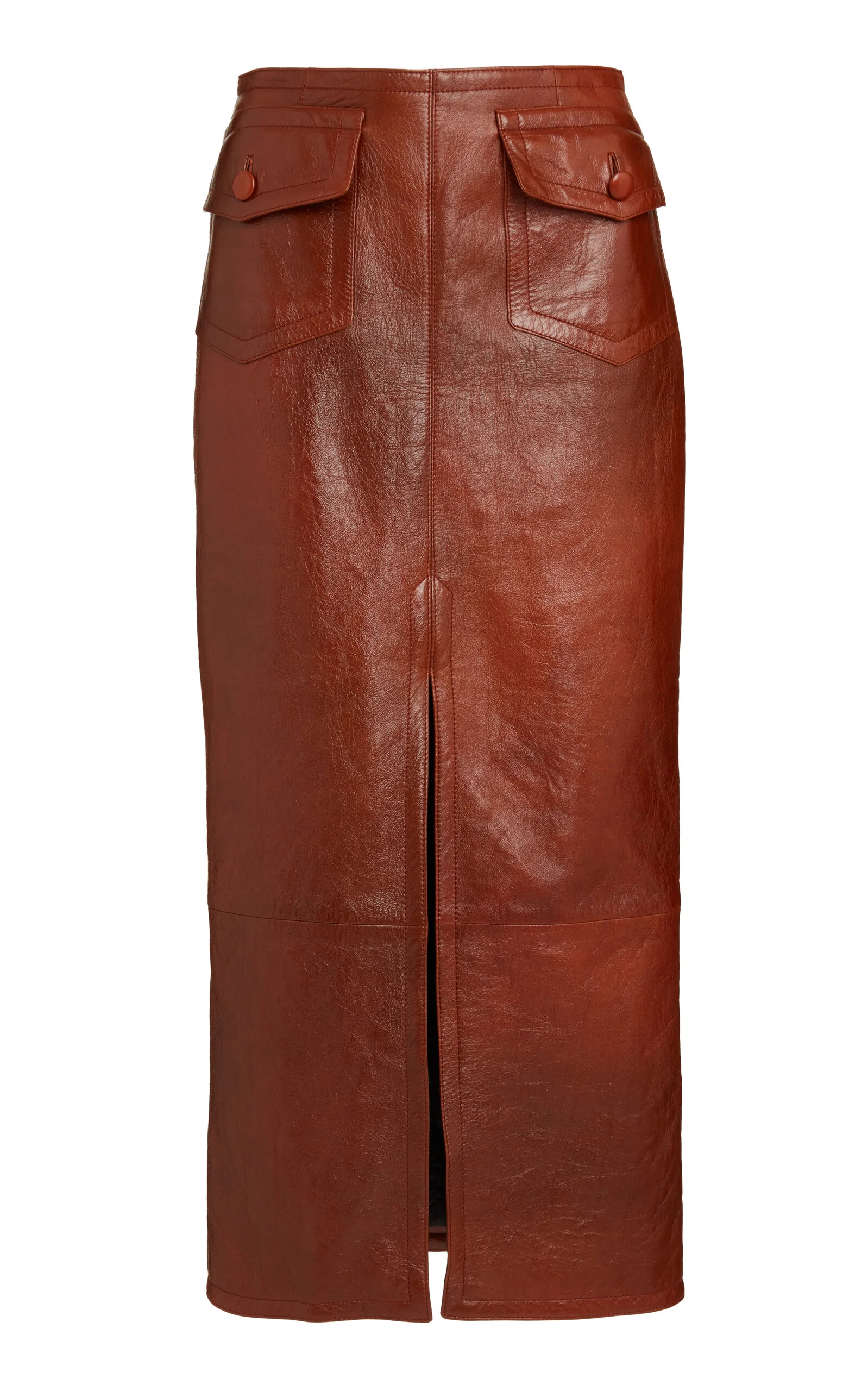 Creative Director Chemena Kamali ushers in an empowering, bohemian ease for Fall ’24 with ‘70s-inspired volume and slick leather layers that left the entire industry smitten. This pencil midi skirt is tailored from polished leather and finished with duo-utility pockets and a front vent for ease with movement. PRODUCT DETAILS - Fall/Winter '24 - Concealed zip fastening along back - Composition: 100% Leather - Designer color: Clay Brown - Dry clean - Imported SIZE & FIT - Our model is wearing a size FR 34 - Model is 5'9" with a 30" bust, 23" waist, and 34" hip - Designed for a slim fit