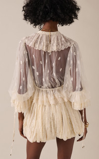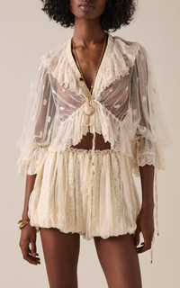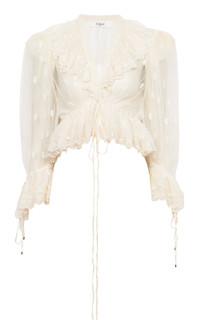 Founded in 1952, the legendary French Maison is renowned for its bohemian couture that strikes notes of youthful nostalgia and sunny nonchalance. This top is in soft white that features a V-neckline, and half bishop sleeves with lace leavers by the hemline. PRODUCT DETAILS - Spring/Summer '25 - Button fastening through front - Composition: 100% Polyester; Braid 53% Polyester , 47% Silk; Collar 100% Silk; Button 100 Mop Mop (Pinctada Maxima) Pinctada Maxima Australia Farmed - Designer Color: Whisper White - Dry clean only - Made in France SIZE & FIT - Our model is wearing a size FR 34 - Model is 5'9.5" with a 30.5" bust, 23" waist, and 34.5" hip