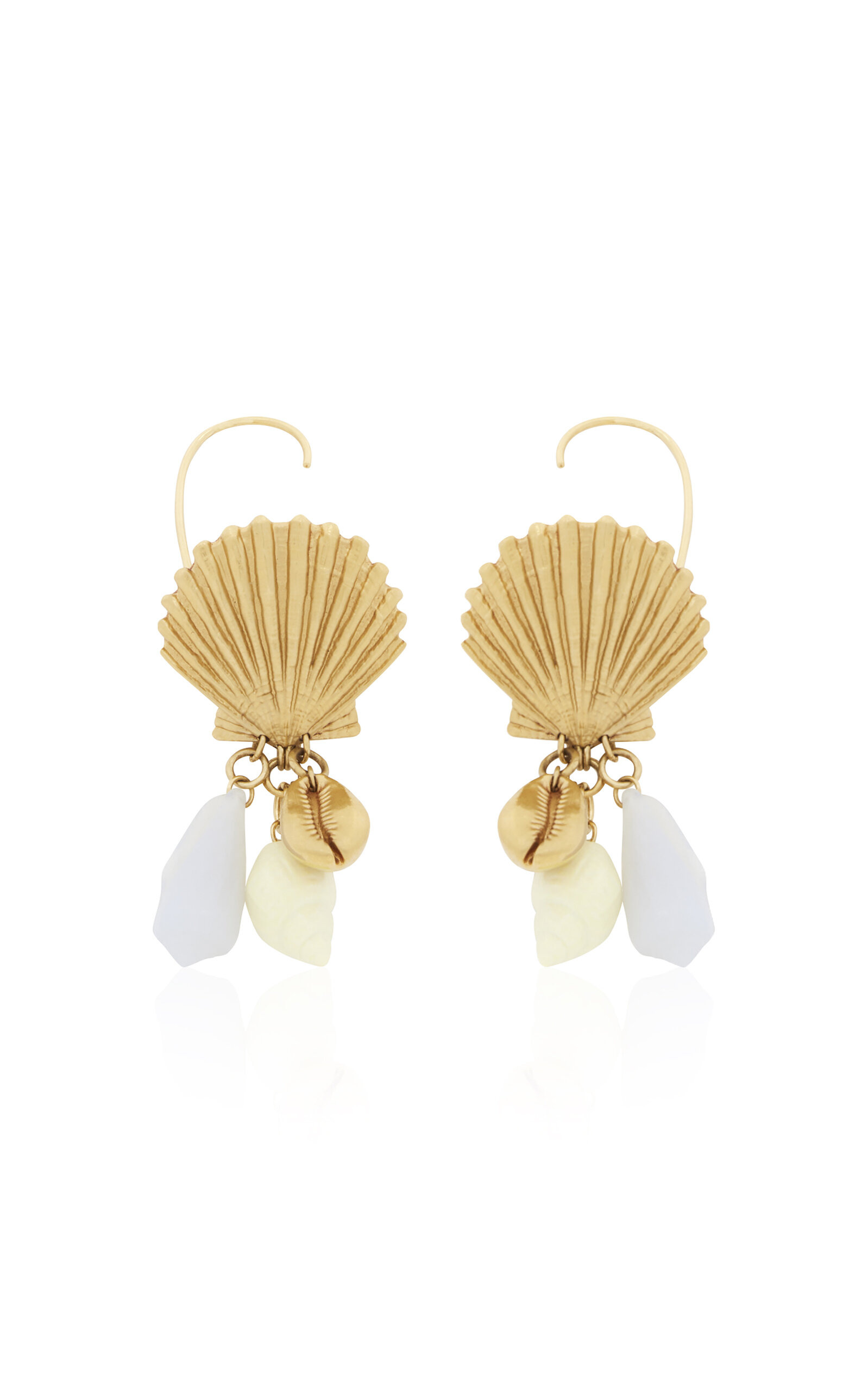 PRODUCT DETAILS - Statement drop earrings silhouette, gold-toned brass body, resin drop embellishments, shell motif - Composition: brass & resine - Made in Italy
