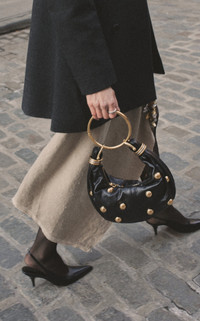 Creative Director Chemena Kamali ushers in an empowering, bohemian ease for Fall ’24 that left the entire industry smitten. Crafted from grained calfskin leather with subtle sheen, this bag is studded with gold-toned hardware and features a ring handle that carries on the wrist like a bracelet. PRODUCT DETAILS - Zip fastening - Composition: shiny grained calfskin - Made in Italy