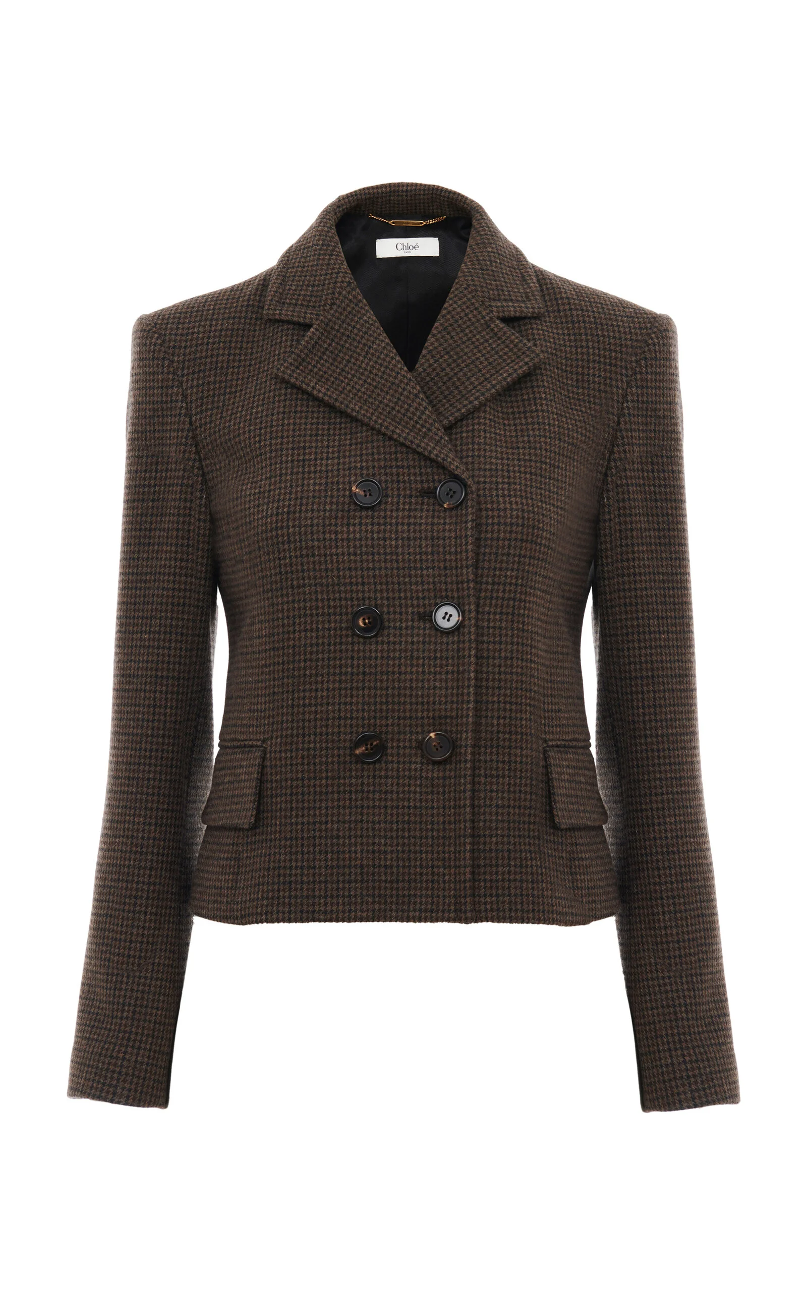 Founded in 1952, the legendary French Maison is renowned for its bohemian couture that strikes notes of youthful nostalgia and sunny nonchalance. Tailored from lower-impact wool in a mini houndstooth weave, this double-breasted jacket has a cropped, fitted cut with sharp lapels and front flap pockets. Layer it over lace or denim. PRODUCT DETAILS - Fall/Winter '25 - Button fastening through front - Composition: 100% lower impact wool; Lining: 51% Viscose, 49% Cotton - Dry clean only - Made in France