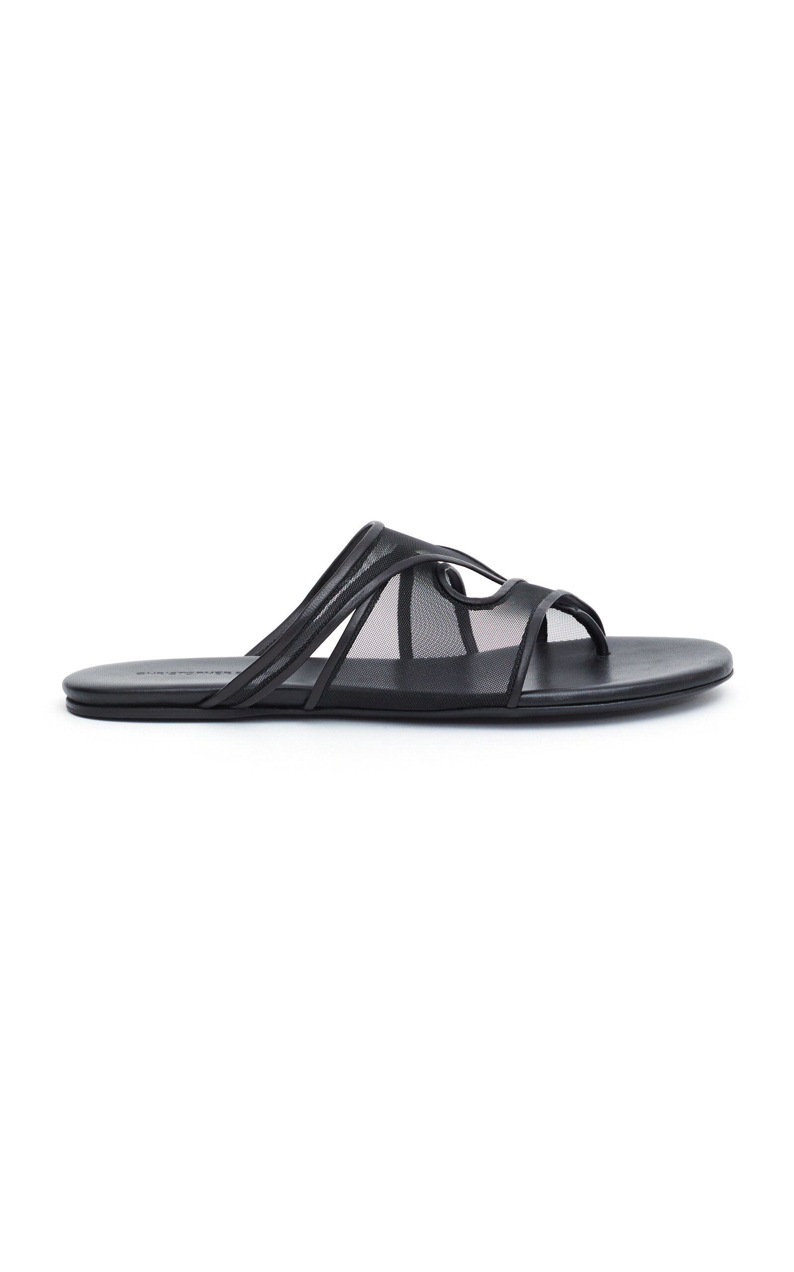 PRODUCT DETAILS - Flat flip flops silhouette, leather body, criss-cross mesh upper - Slip on - Composition: 100% nylon upper, 100% nappa leather lining, 100% cow leather sole - Made in Italy
