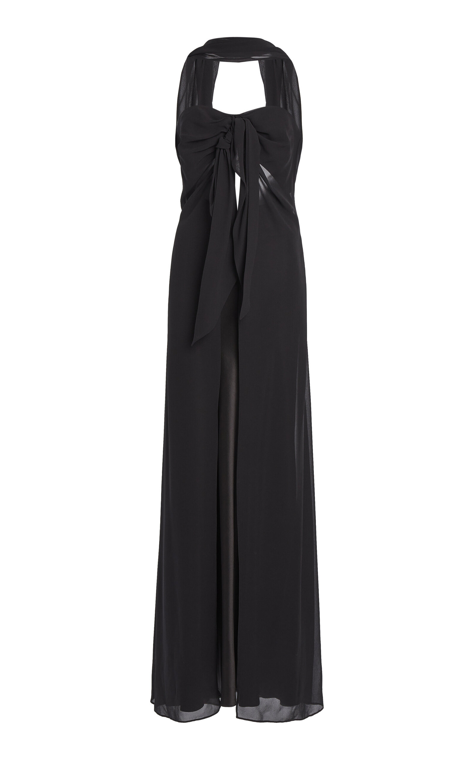 PRODUCT DETAILS - Scarf neck, tie bust, layered design, midi hem - Concealed zip fastening - Composition: 100% Silk - Color: black - Dry clean only - Pre-Fall '25