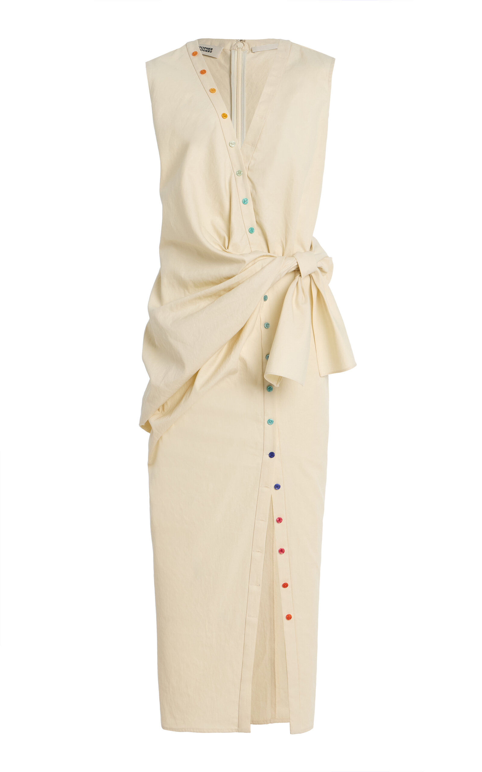 NYC-based designer Christopher John Rogers creates "emotional and sensitive clothing with a focus on effortful dressing". Cut from washed cotton, this sleeveless midi features decorative rainbow buttons lining the front placket and gathered ties that cinch the waist. PRODUCT DETAILS - Pre-Fall '25 - Zip fastening along back - Composition: cotton - Designer color: Macadamia - Dry clean - Made in the USA SIZE & FIT - Designed for a slim fit