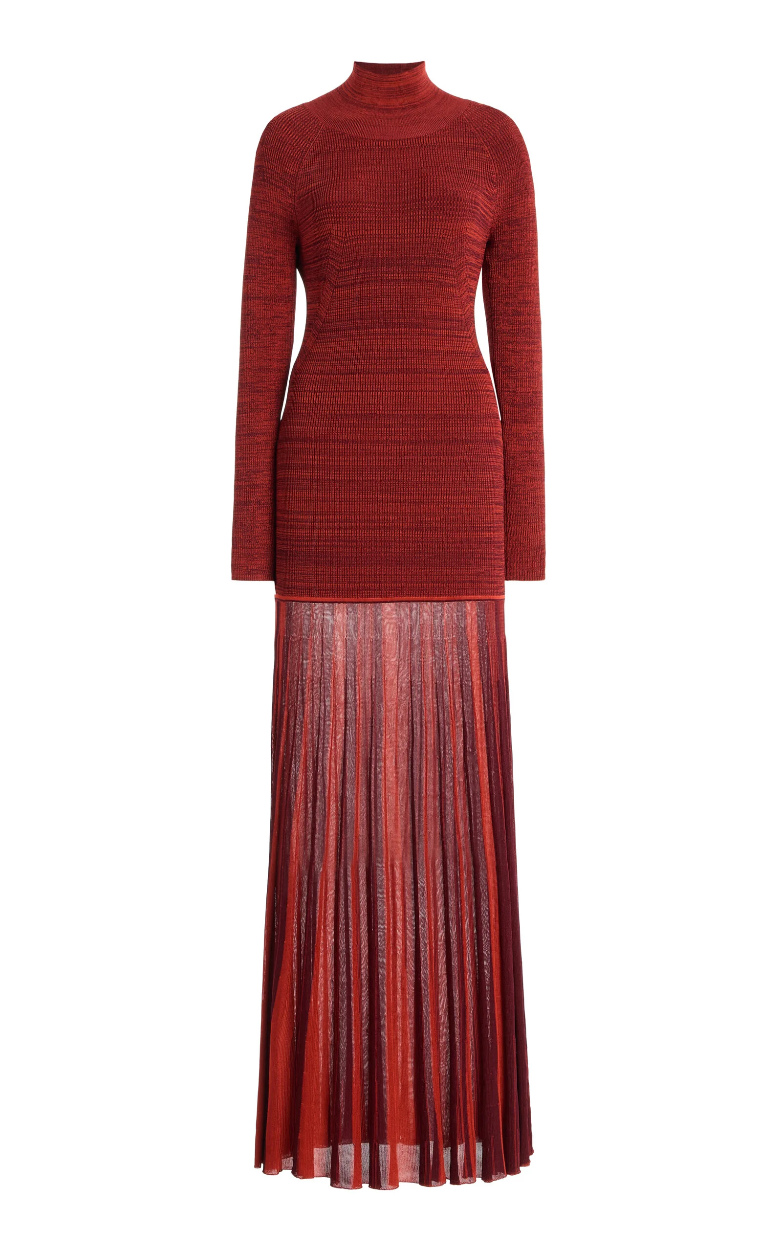NYC-based designer Christopher John Rogers creates "emotional and sensitive clothing with a focus on effortful dressing". This high-neck dress has a figure-hugging silhouette made from a contoured rib-knit with a sheer skirt that falls from the hip. PRODUCT DETAILS - Resort '26 - Slip on - Composition: 100% rayon - Designer color: Sarsaparilla - Dry clean - Imported