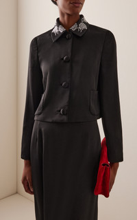 Those in the know have been staunchly following Lucy Akin’s rise—and with good reason: she captures an effortless L.A. cool that appeals to women all over. The Arlene Jacket in black is a satin tailored suit jacket. Its slightly cropped fit and white floral embroidery on the collar add a chic detail that make this timeless shape special for the holiday season. Pair it with the Elly skirt and your head to toe Ciao Lucia look is sure to be the set of the season. PRODUCT DETAILS - Fall '25 - Button fastening - Composition: 100% polyester - Dry clean only - Imported