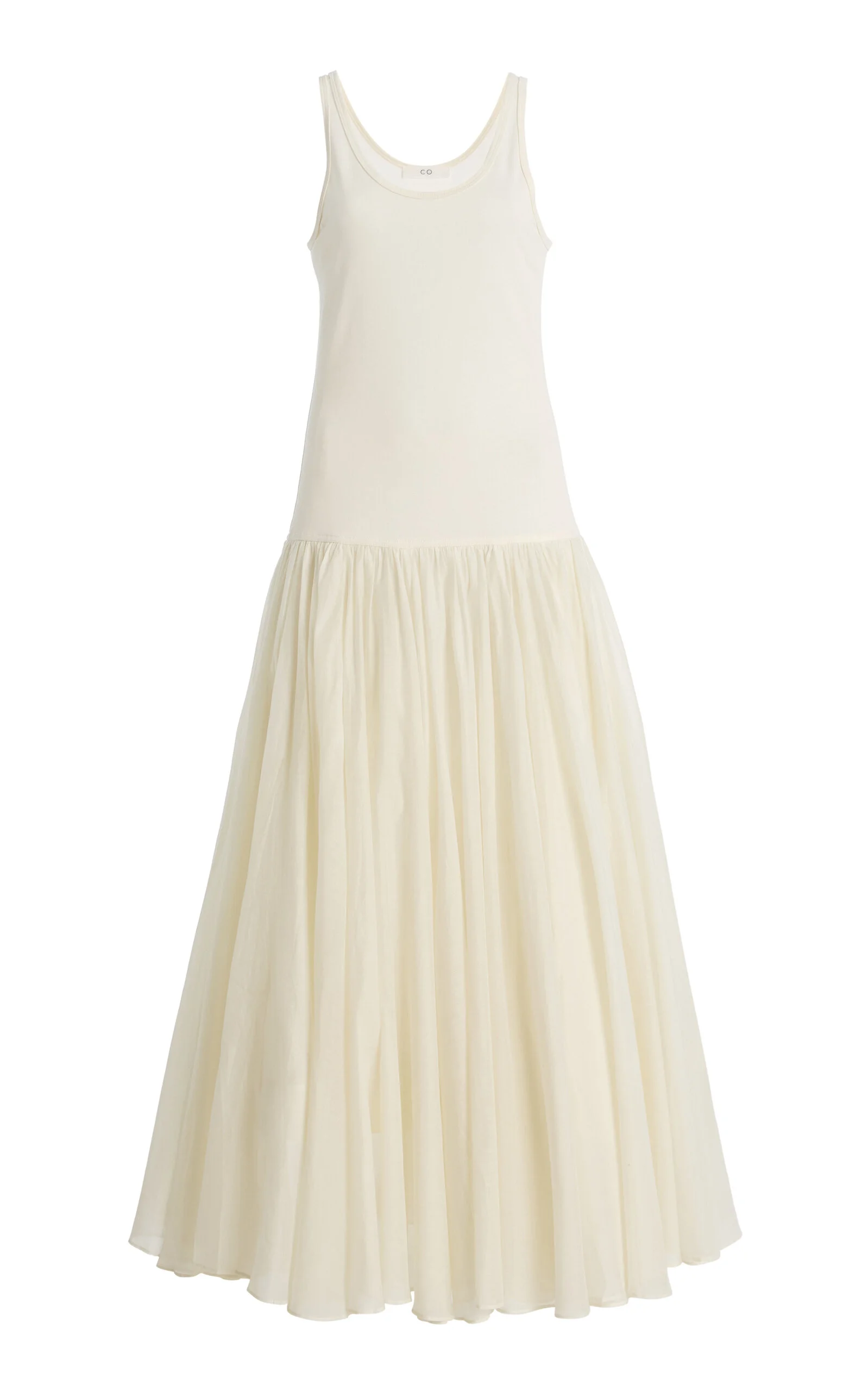 Co-founder Stephanie Danan seamlessly blends American luxury sportswear with European sophistication, bringing a singular visual language shaped by her former career in film and television. The brand remains grounded in its founding principles — exceptional design, thoughtful pricing, functionality, and versatility — while fostering a collaborative and inclusive culture. Cut close through the bodice and released through the skirt, this double-layer dress balances a clean tank silhouette with soft volume. A scoop neckline and wide straps keep the top precise, while gathered crinoline layers introduce light structure and movement through the hem. Crafted in a lightweight cotton-silk blend, it offers a smooth hand with subtle transparency. PRODUCT DETAILS - Spring Summer '26 - Slip on - Composition: 75% cotton, 25% silk - Dry clean - Imported