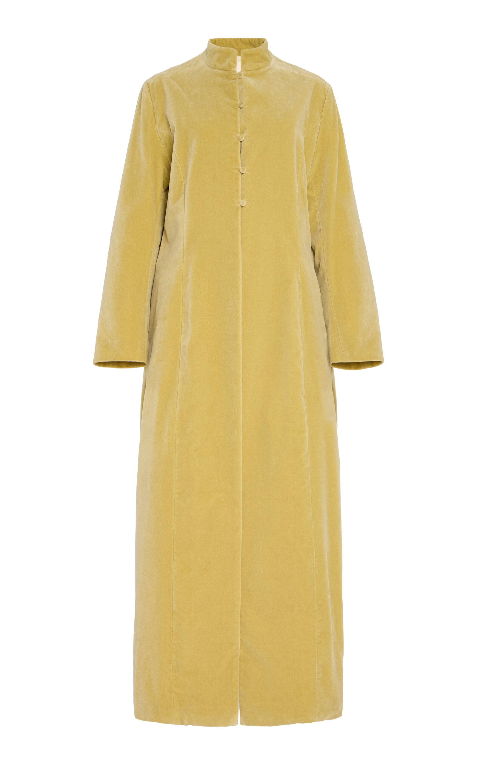 The young creative director and former menswear designer launched her ready-to-wear women’s collection in February ‘24 to critical acclaim. This season, each piece adds to the label’s ethereal aesthetic, exploring femininity through mythical archetypes. Minimal in nature, this house coat is tailored with a stand collar and simple button fastening, sweeping through the frame in cotton-velvet. Place over satin slip dresses or tailored ensemble for evening events and soirees. PRODUCT DETAILS - Fall/Winter ‘25 - Button fastening - Composition: 100% cotton - Dry clean - Designer Color: Celery - Made in the USA