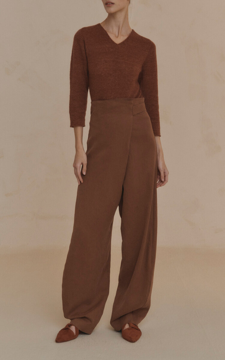 PRODUCT DETAILS - Slim fit, v-neck, three-quarter sleeves - Slip on - Unlined - Composition: 30% Cashmere 30% Silk 40% Baby Alpaca - Color: brown - Dry clean only - Pre Fall '25