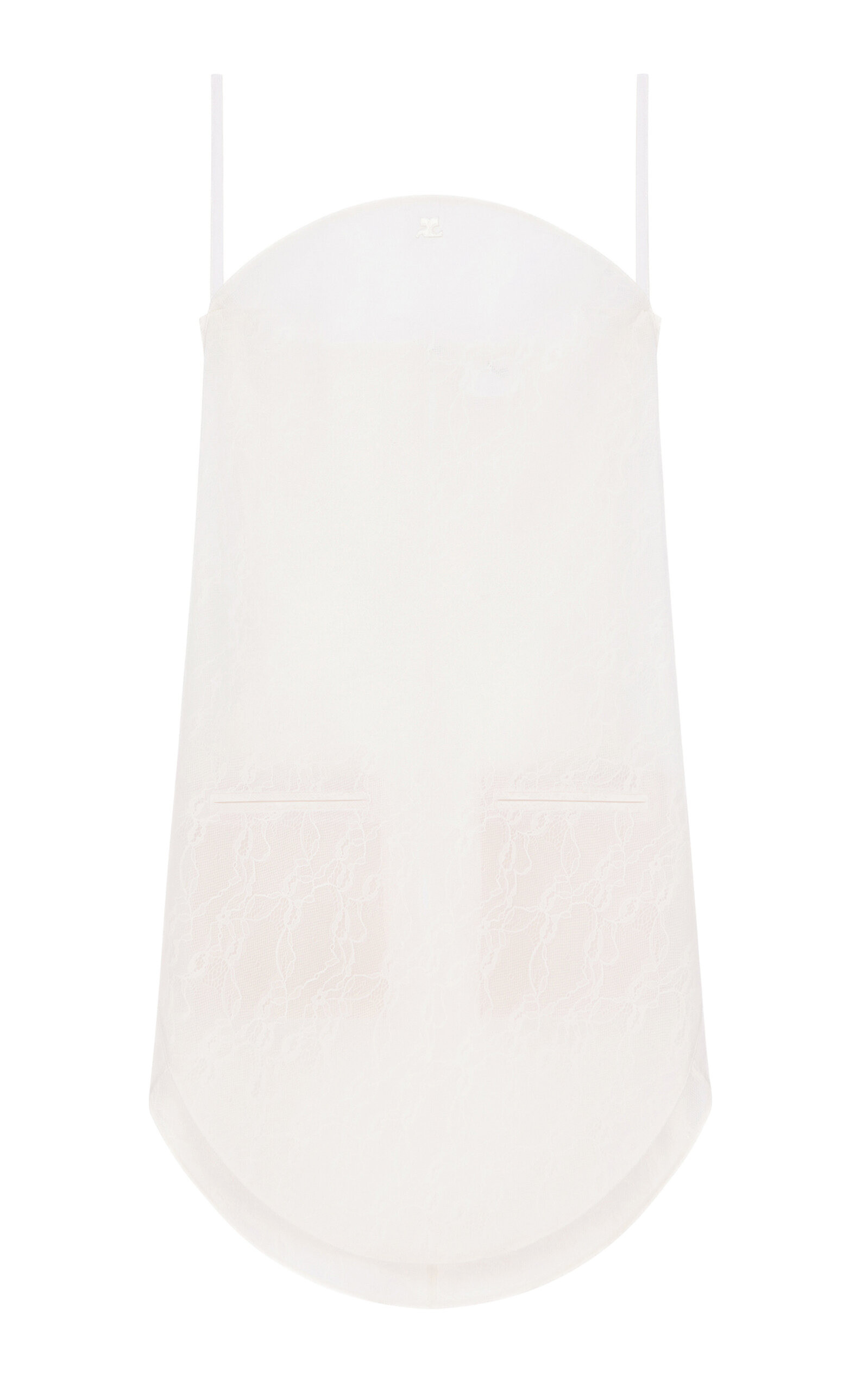 After 12 years alongside Nicolas Ghesquiere and a brief stint at Dior with Raf Simons, Courreges artistic director Nicolas Di Felice has brought the renowned French fashion house back to life. Crafted from floral lace, this slip dress features slim straps, a curved hem, and a barely-there silhouette. Dress it up or down with your accessories of choice. PRODUCT DETAILS - Pre-Fall '25 - Slip on - Composition: 54% polyamide/nylon 32% polyester 8% polyurethane 6% elastane - Dry clean - Made in Italy