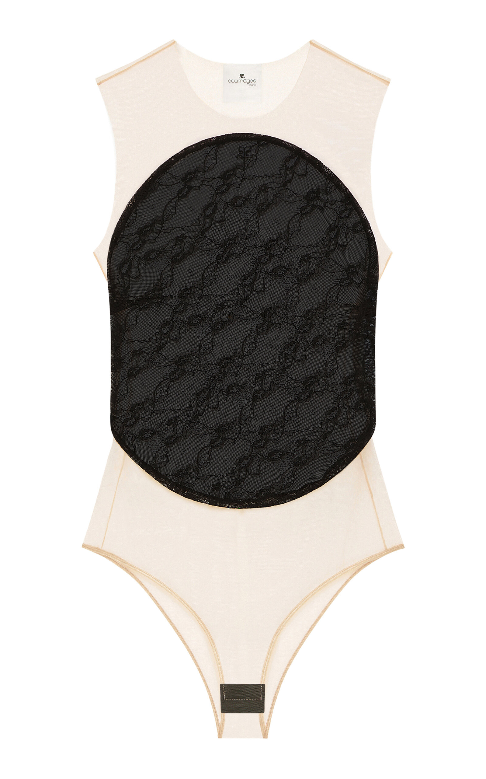 After 12 years alongside Nicolas Ghesquiere and a brief stint at Dior with Raf Simons, Courreges artistic director Nicolas Di Felice has brought the renowned French fashion house back to life. This sleeveless bodysuit is cut from sheer stretch mesh with a contrasting circular lace panel. It fits close to the body and fastens with snaps at the base. Wear it with low-rise trousers or layered underneath a jacket. PRODUCT DETAILS - Pre-Fall '25 - Snap fastening at base - Composition: 90% polyamide/nylon 10% elastane - Dry clean - Made in France