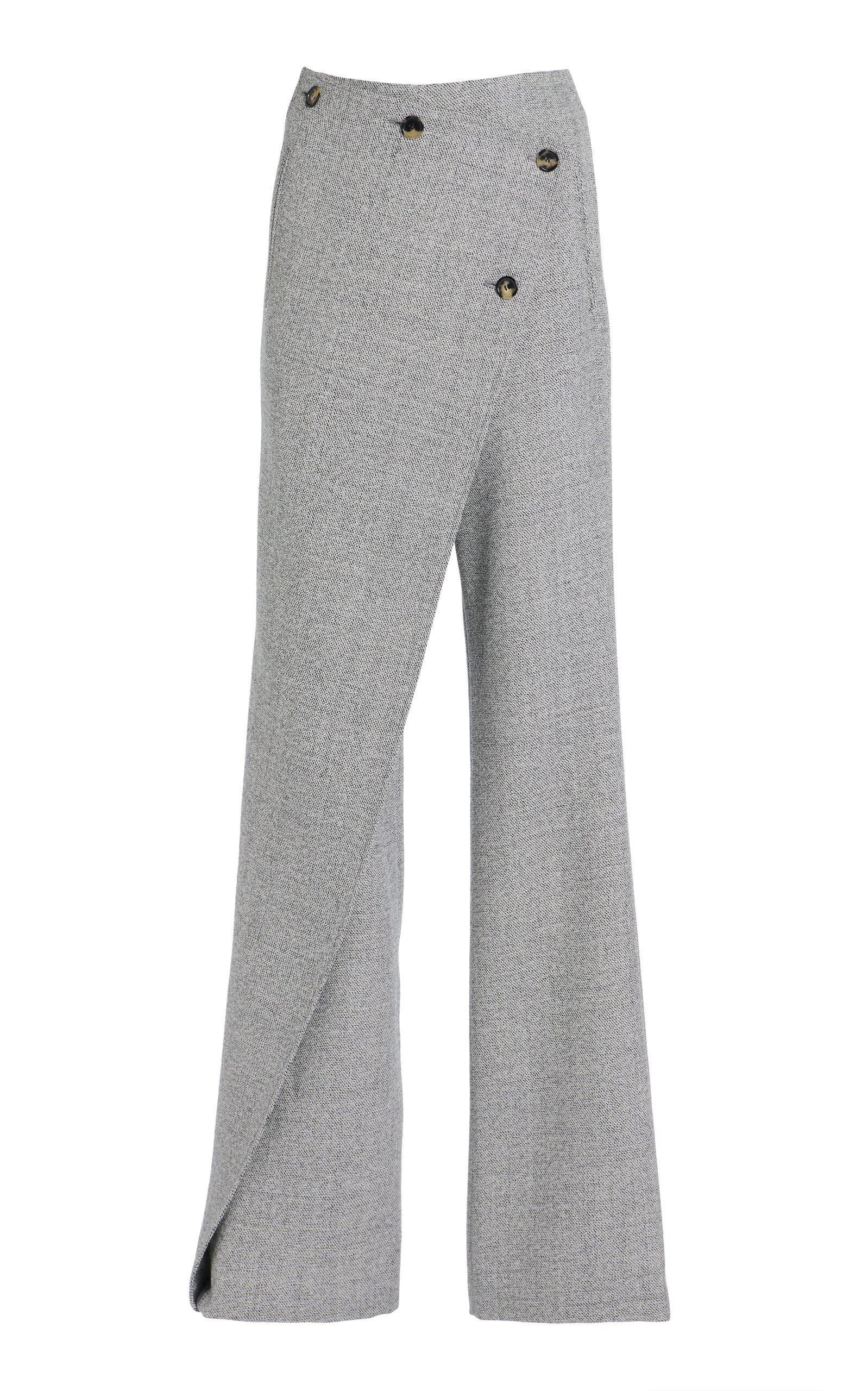 After 12 years alongside Nicolas Ghesquiere and a brief stint at Dior with Raf Simons, Courreges artistic director Nicolas Di Felice has brought the renowned French fashion house back to life. Tailored to a slim, straight-leg silhouette, these mid-rise trousers feature a distinctive wrapped panel with button details that creates an asymmetric, oblique effect at the front. Pair with a fitted bodysuit or structured blazer. PRODUCT DETAILS - Fall-Winter '25 - Front Button Closure - Composition: 100% Wool 100% Viscose - Dry Clean Only - Color: grey - Made in France