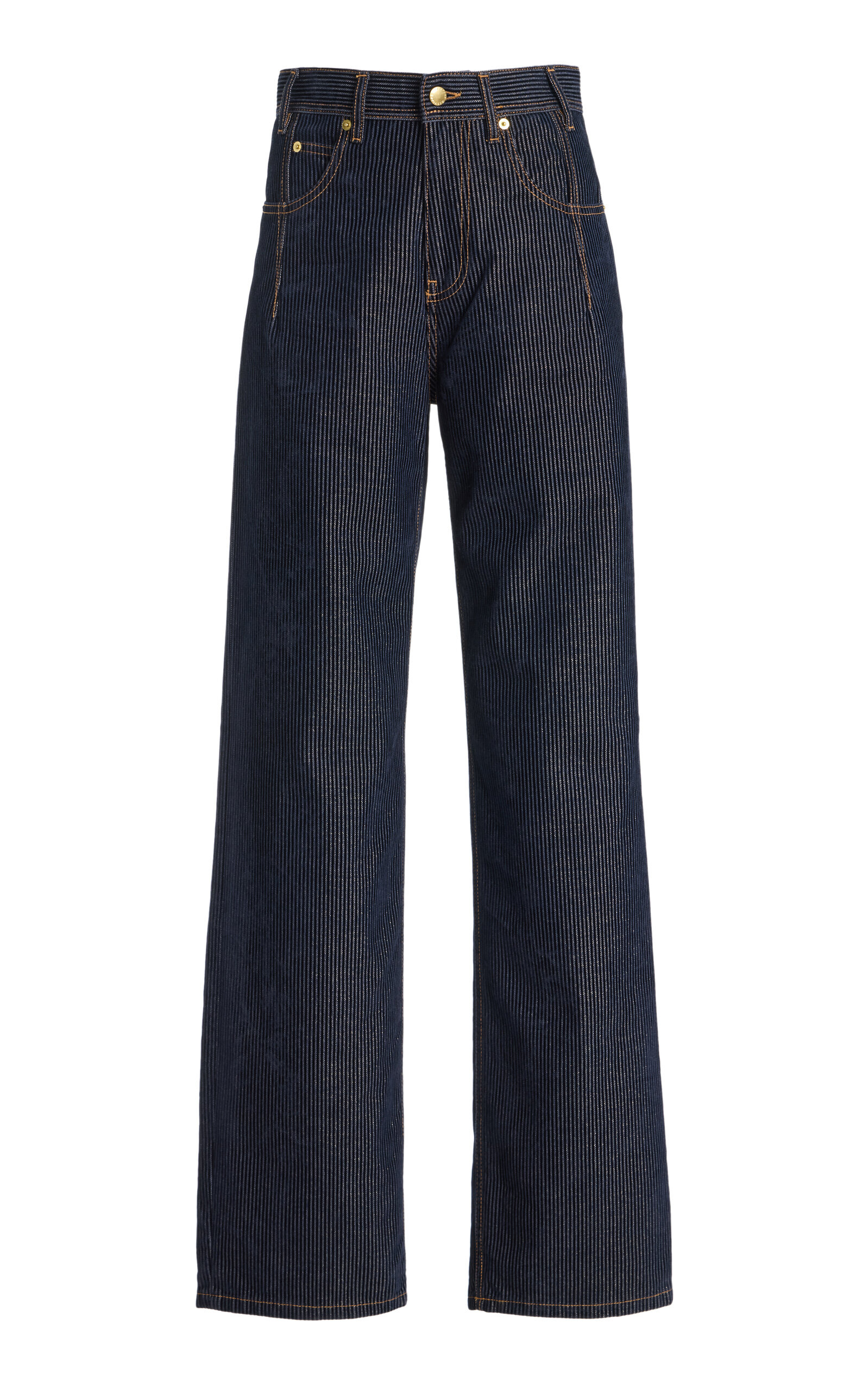 Founded in 2021 by Inna Gerchikov, DARKPARK is inspired by her desire to find bottoms that fit her personal style. Today, it’s the go-to destination for pants and denim embracing experimental washes, quirky treatments, and unconventional designs presented through roomy, wide-legged silhouettes. Cut from metallic corduroy, 'Lu' is a straight-leg jean with a pleat effect through the leg. PRODUCT DETAILS - Fall '25 - Zip fly fastening - Composition: 69% cotton, 26% viscose, 3% polyester, 2% polyamide; Lining: 65% polyester, 35% cotton - Designer color: Raw Blue Denim - Dry clean - Made in Italy
