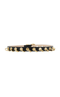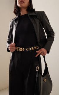 Déhanche: The French word for the asymmetrical position of the hips in ancient Greek statues. Inspired by vintage belts from the 80s and 90s, the label takes a modern approach to to the wardrobe staple with references with art and architecture. The 'Revenge' belt's grommets and rings pay homage to the rebellious spirit of punk fashion and S&M subculture, resulting in an accessory that captivates with its audacious charm. Handcrafted in Italy, the belt features smooth black leather, grommets and ring charms that are placed individually by hand. PRODUCT DETAILS - Buckle fastening - Composition: gold zamack alloy metal hardware, vegetable-dyed calfskin leather, nubuck lining - Handmade in Italy SIZE & FIT - Height: 1"