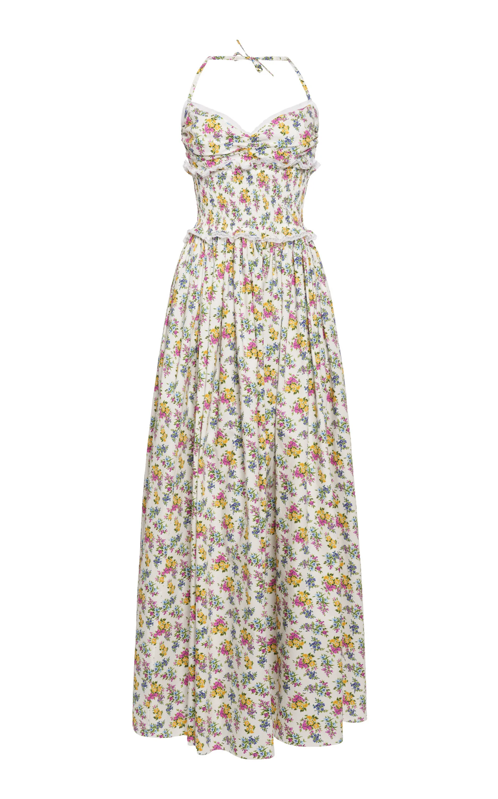 Each season, Domenico Dolce and Stefano Gabbana deliver a healthy dose of sex appeal inspired by the archives. You'll find prints that nod to the glamour and culture of Italy and figure-accentuating dresses and separates that celebrate the female form. Emblazoned in a renowned floral print, this retro-inspired dress has lace-lined cups and a shirred waistline, followed by a billowing maxi skirt. Wear along with some of the label’s latest accessories. PRODUCT DETAILS - Resort ‘26 - Concealed zip fastening - Composition: 90% cotton, 10% polyamide - Dry clean - Made in Italy SIZE & FIT - Our model is wearing a size 36 - Model is 5’9.5” with a 30.5” bust, 23” waist, and 34.5” hip - Fits true to size, our fit specialist recommends taking your normal size