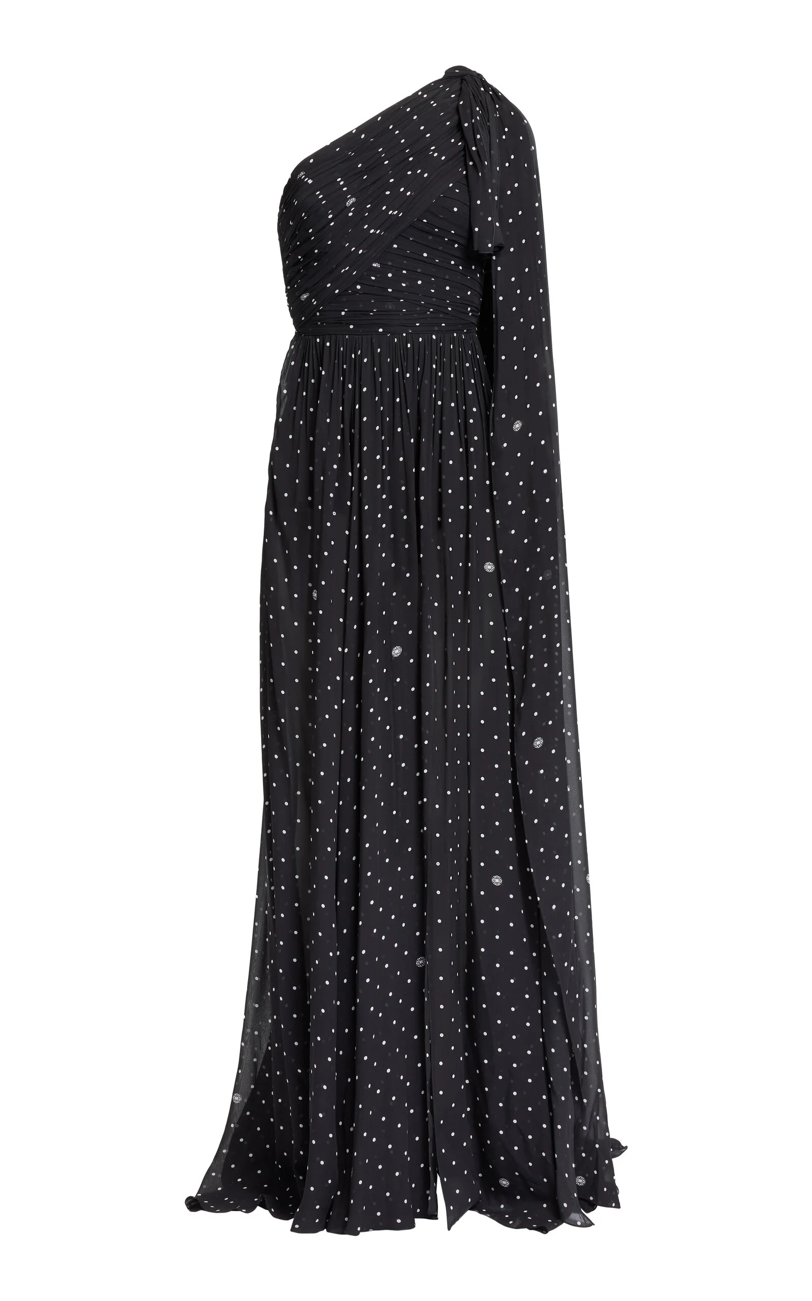 PRODUCT DETAILS - Full Lining Crepe De Chine, Except For Lace Insert. Complementary Silk Scarf.120 Cm Length From The Waist - Regular fit, one-shoulder cape detail, slit, maxi hem - Concealed zip fastening at back - Fully lined - Composition: 100%VI - Color: Black polka dots - Dry clean - Resort '26