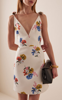 PRODUCT DETAILS - Slim fit, V neckline with ribbon-tie straps, floral printed throughout, mini dress - Zip Fastening Through Back - Fully Lined - Composition: 100% Polyester - Color: floral - Dry Clean Only - Pre-Fall '25