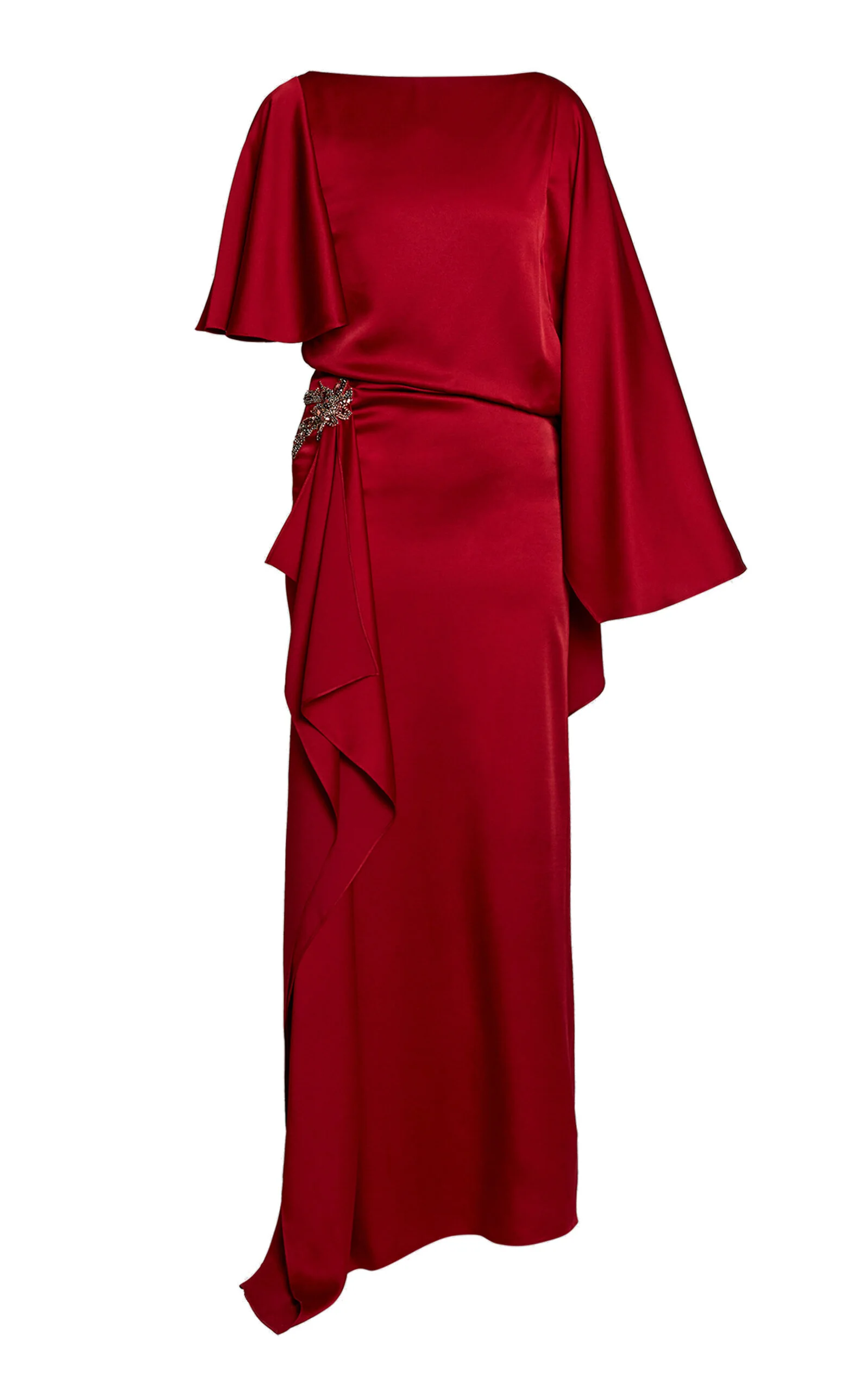 PRODUCT DETAILS - Slim fit, one half sleeve, one long sleeves, draping, embellishments - Zipper fastening - Lined - Composition: 71% Acetate, 29% Viscose; Lining: 100% Silk; Emb: 40% Brass ,40% Glass, 20% Nylon - Color: Ruby Red - Dry Clean - Fall '25