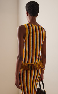 Founded in 2013 by sisters Chiara and Giuliana Macchiavello, ESCVDO is inspired by and dedicated to the duo’s Peruvian heritage, focusing on ancestral weaving techniques with a modern take and ethical approach. Handmade in Peru, the 'Misti' top is crafted from crocheted cotton with a fringed hem. Pair it with the matching skirt. PRODUCT DETAILS - Pre-Fall '25 - Slip on - Composition: 100% cotton - Designer color: Yellow/ Tobacco - Dry clean - Made in Peru