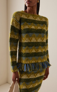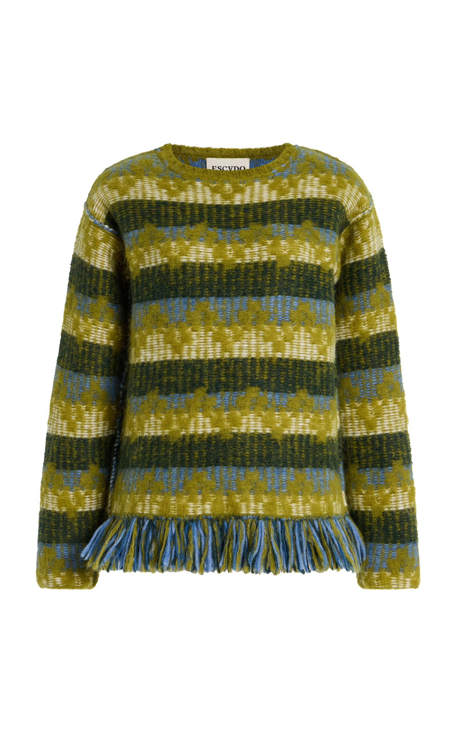Founded in 2013 by sisters Chiara and Giuliana Macchiavello, ESCVDO is inspired by and dedicated to the duo’s Peruvian heritage, focusing on ancestral weaving techniques with a modern take and ethical approach. Handcrafted in Peru, the 'Salkantay' crewneck sweater has an oversized silhouette knit from an alpaca-wool jacquard with a fringed hem. Wear yours with the matching mini. PRODUCT DETAILS - Fall '25 - Slip on - Composition: 80% baby alpaca, 20% wool - Designer color: Green/ Sky Blue - Dry clean - Handmade in Peru SIZE & FIT - Our model is wearing a size Small - Model is 5’9.5" with a 32" bust, 24" waist, and 35.5" hip