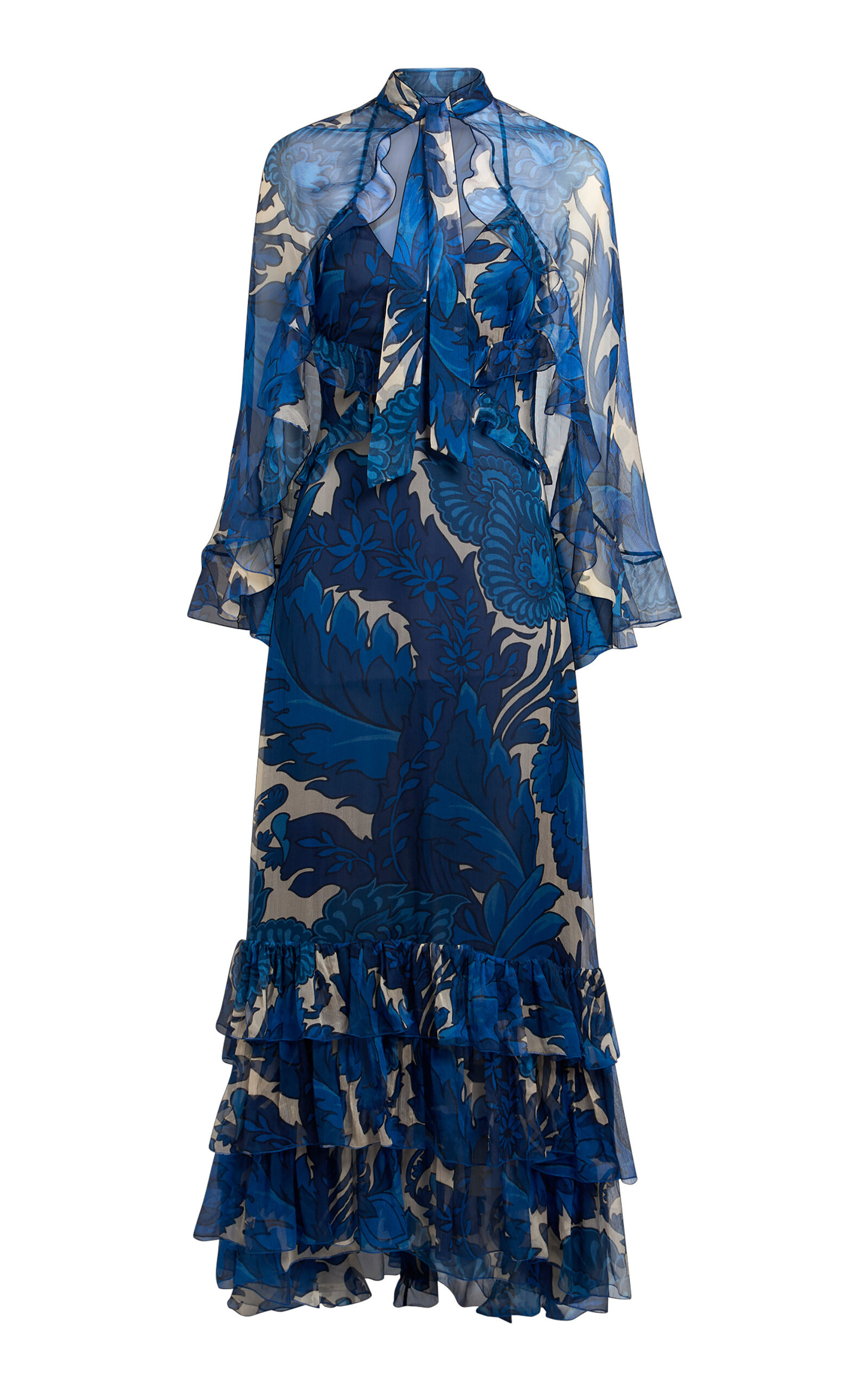 PRODUCT DETAILS - Long fluted sleeve, mock neck, tiered ruffle skirt, maxi hem - Concealed zip fastening along back - Lined - Composition: 100% Silk - Color: Stampa F.Do Azzurro - Dry clean only - Spring/Summer '25
