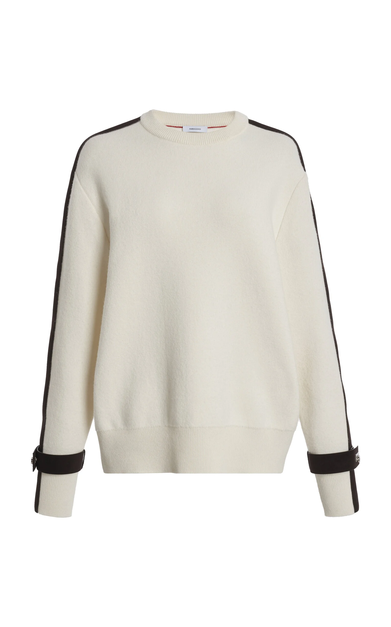 The epitome of everyday luxury, Ferragamo was founded in 1927 by legendary designer Salvatore Ferragamo, known as the "shoemaker to the stars." Under the design direction of Maximilian Davis, today the Florentine house pays homage to the founder's legacy by fusing enduring Italian craftsmanship and contemporary design — with environmental sustainability at its core. This sweater is spun from soft virgin wool with a compact weave. It's contrast-trimmed design is finished with a silver-tone metal clasp at the wrist. PRODUCT DETAILS - Resort '26 - Slip on - Composition: 100% Virgin Wool - Dry clean only - Made in Italy SIZE & FIT - Designed for a relaxed fit