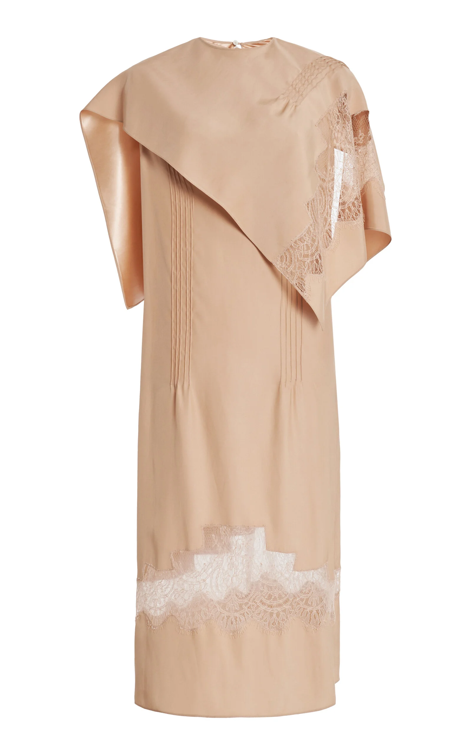 The epitome of everyday luxury, Ferragamo was founded in 1927 by legendary designer Salvatore Ferragamo, known as the "shoemaker to the stars." Under the design direction of Maximilian Davis, today the Florentine house pays homage to the founder's legacy by fusing enduring Italian craftsmanship and contemporary design — with environmental sustainability at its core. Crafted from organic silk crepe de chine, this floaty, light-as-air midi dress is trimmed with Chantilly lace and topped with a capelet. PRODUCT DETAILS - Resort '26 - Button fastening at nape - Composition: 100% Silk - Designer color: Nude - Dry clean only - Made in Italy SIZE & FIT - Designed for a relaxed fit