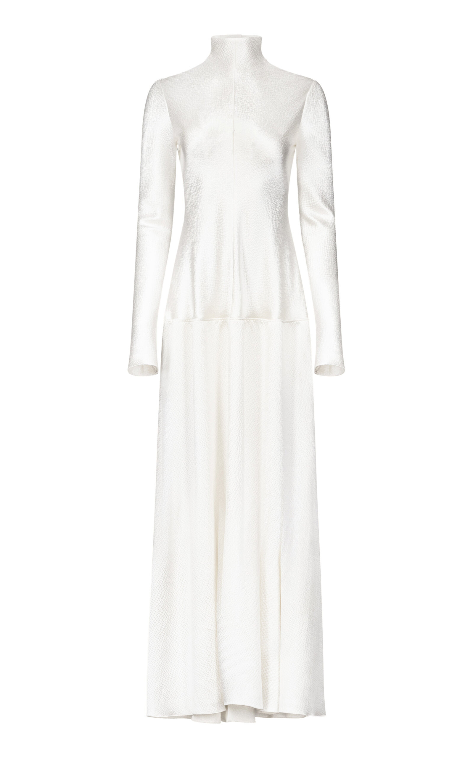 PRODUCT DETAILS - Slim fit, high neckline and long sleeve, drop waist silhouette - Zip Closure Through Back - Unlined - Composition: 100% Viscose - Color: ivory - Dry Clean Only - Fall-Winter '25