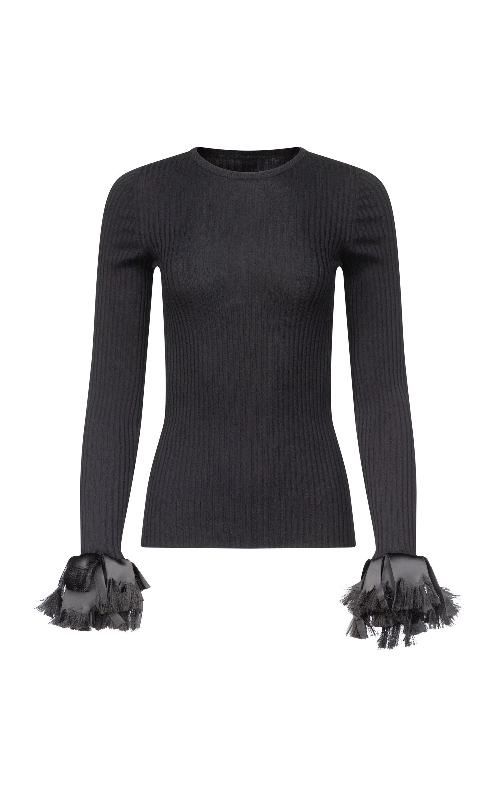 PRODUCT DETAILS - Slim fit, rounded neckline with fringed cuff sleeves, belt with tassel detail - Pull Over - Unlined - Composition: 100% Wool - Color: black - Dry Clean Only - Fall-Winter '25