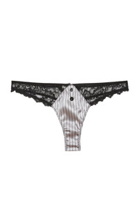 Fleur du Mal is a luxury lingerie, ready-to-wear, and swim brand founded by Jennifer Zuccarini. Thong with black lace detailing and a black/white pinstripe pattern. PRODUCT DETAILS - Pull on - Composition: 92% silk, 8% elastane; Combo: 61% recycled nylon, 20% nylon, 19% elastane; Gusset: 100% cotton - Hand wash - Imported