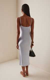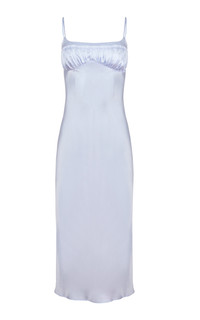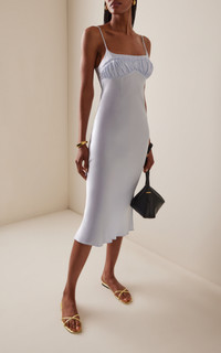 Fleur du Mal is a luxury lingerie, ready-to-wear, and swim brand founded by Jennifer Zuccarini. The Ruched Bust Dress, featuring flattering scoop neckline with ruched bust and mini ruffled edges. Luxe bias cut silk with adjustable shoulder straps. Midi length hits just below the knee. Take it from the bar to the bedroom with your favorite Essentials panty. PRODUCT DETAILS - Spring '25 - Slip on - Composition: 100% silk - Designer color: Cloud - Dry clean - Imported