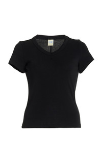 Flore Flore’s timeless cotton staples are crafted with clean, simple lines and flattering cuts—made to be worn every day. Made in a medium-weight organic cotton baby rib, the 'Jill' is a fitted V-neck baby tee with short sleeves and a double stitched cut-off seam on the back. PRODUCT DETAILS - Pre-Fall '24 - Slip on - Composition: 100% Organic Cotton - Machine wash - Imported SIZE & FIT - Our model is wearing a size Small - Model is 5’10" with a 31.5" bust, 23.5" waist, and 35" hip - Designed for a shrunken fit