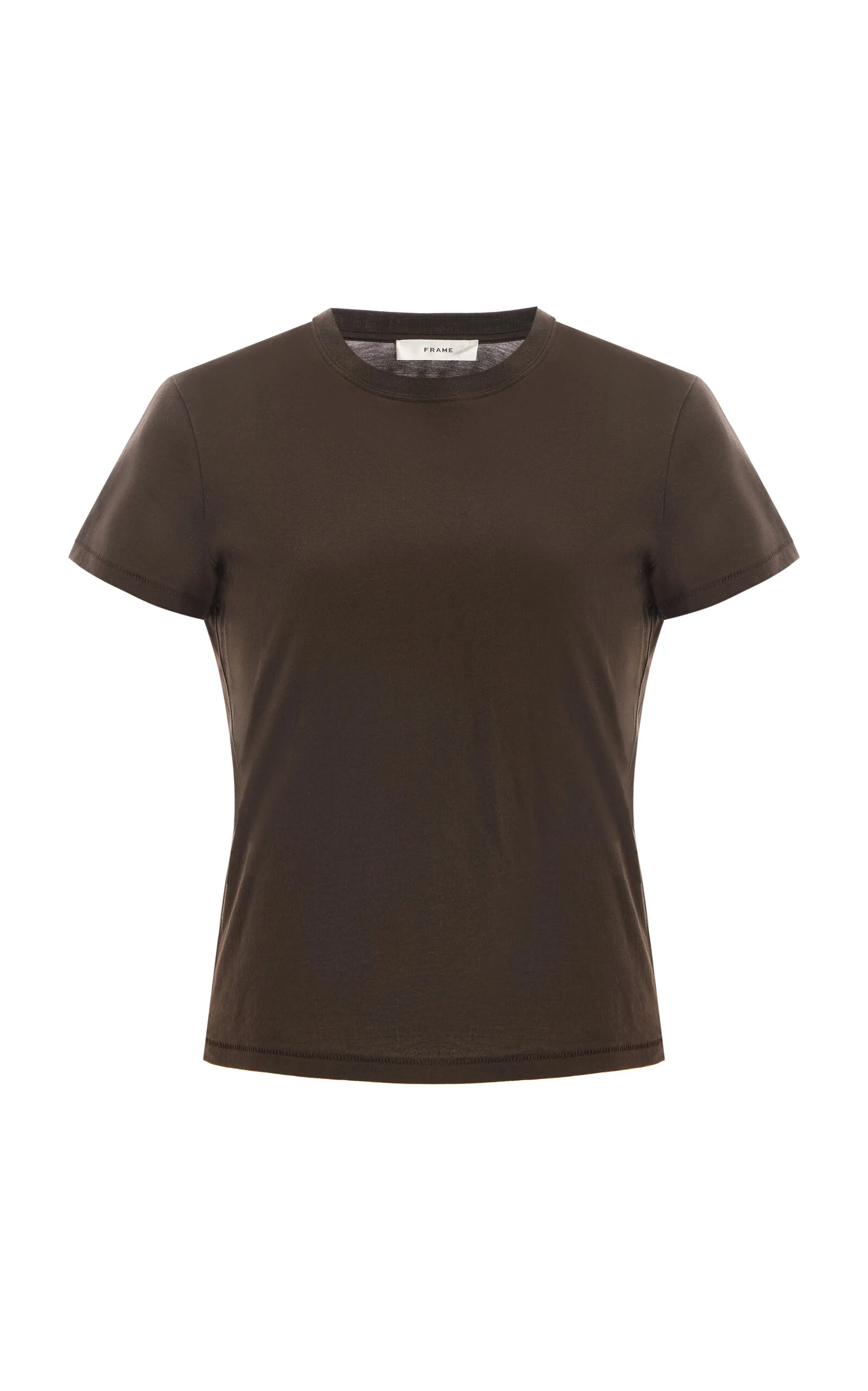 FRAME has distinguished itself in a bustling denim market by concentrating on quality materials and a superb fit that distinguishes even the simplest styles. Crafted in indulgently soft long-staple Supima cotton, this baby tee is your go-to everyday T-shirt. Cut to a slightly shrunken fit, you can pair it with denim for a chic, fuss-free uniform. PRODUCT DETAILS - Resort '25 - Slip on - Composition: 100% Supima cotton - Designer color: Americano - Dry clean - Made in Peru SIZE & FIT - Our model is wearing a size Small - Our model is 5'11" with a 30" bust, 24" waist, and 34" hip