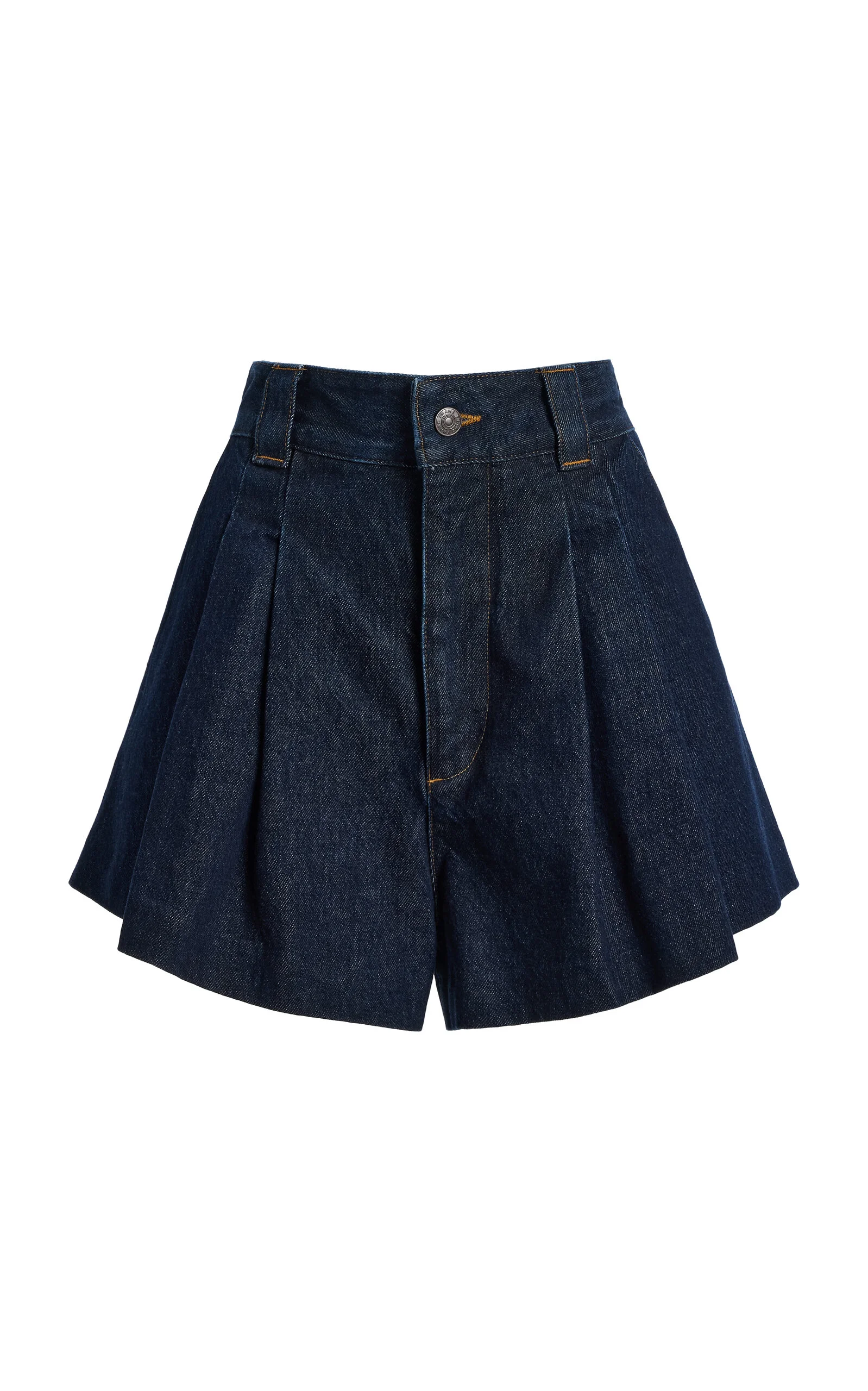 FRAME has distinguished itself in a bustling denim market by concentrating on quality materials and a superb fit that distinguishes even the simplest styles. Crisp pleats form a structural silhouette. The high-rise short is crafted from regenerative cotton in classic dark-wash denim, with an A-line fit that flares just enough. Tailored but easy—wear it with everything from tanks to poplin shirting. PRODUCT DETAILS - Spring '26 - Zip fly fastening - Composition: 100% regenerative cotton - Designer color: Rinse - Machine wash - Imported