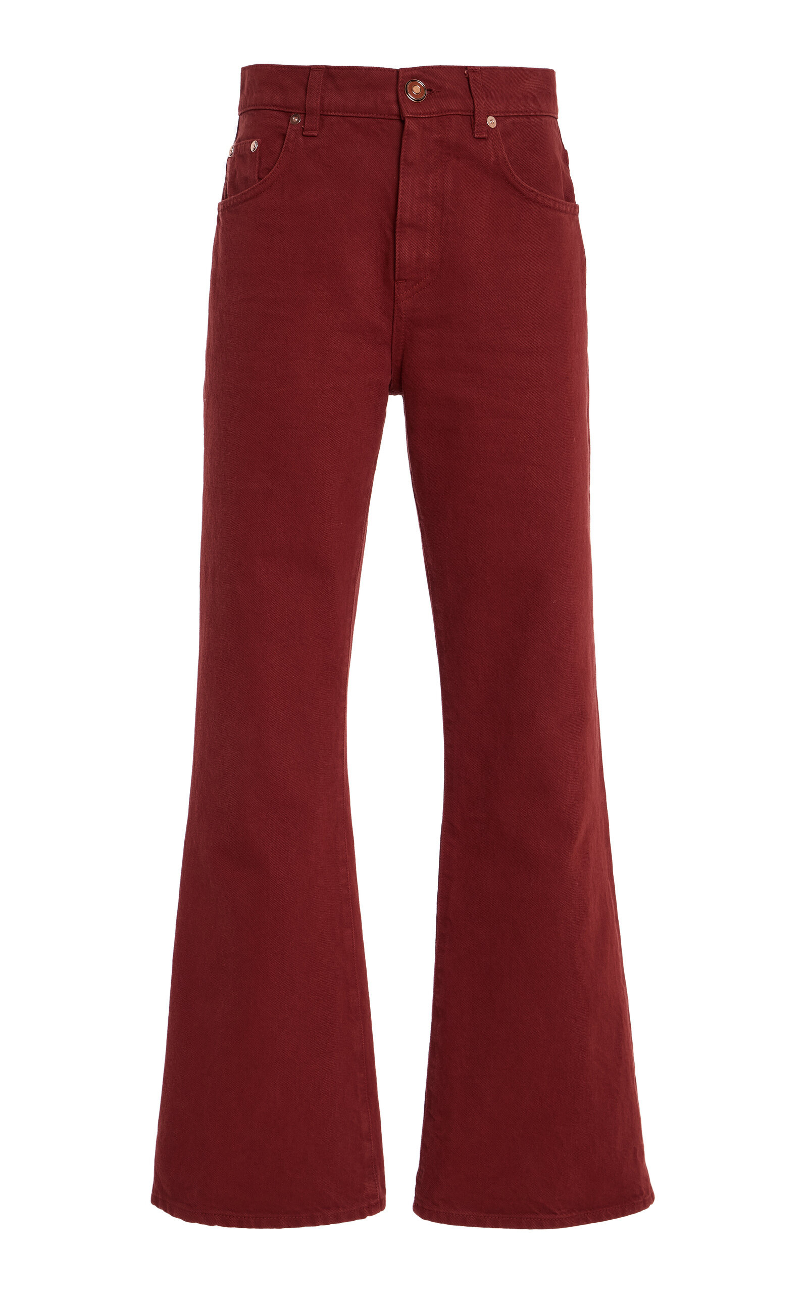 The sustainability pioneer is the industry leader in luxurious clothing and accessories that strike an understated elegance, yet are crafted with the utmost attention-to-detail and commitment to ethics. The Ezra Bootcut Jean is crafted from recycled cotton denim, offering a lightweight feel with a structured look. Designed with a classic five-pocket construction and a cropped bootcut silhouette, it is finished with custom hardware at the waistband. They also feature custom wood-inlaid brass buttons at the waist that can be removed for machine-washing. PRODUCT DETAILS - Pre-Fall '25 - Zip fly fastening - Composition: 100% cotton - Designer color: Burnt Sienna - Machine wash - Made in Italy SIZE & FIT - Our model is wearing a size 26 - Model is 5'9.5" with a 32" bust, 24" waist, and 35.5" hip - Fits true to size, our fit specialist recommends taking your normal size