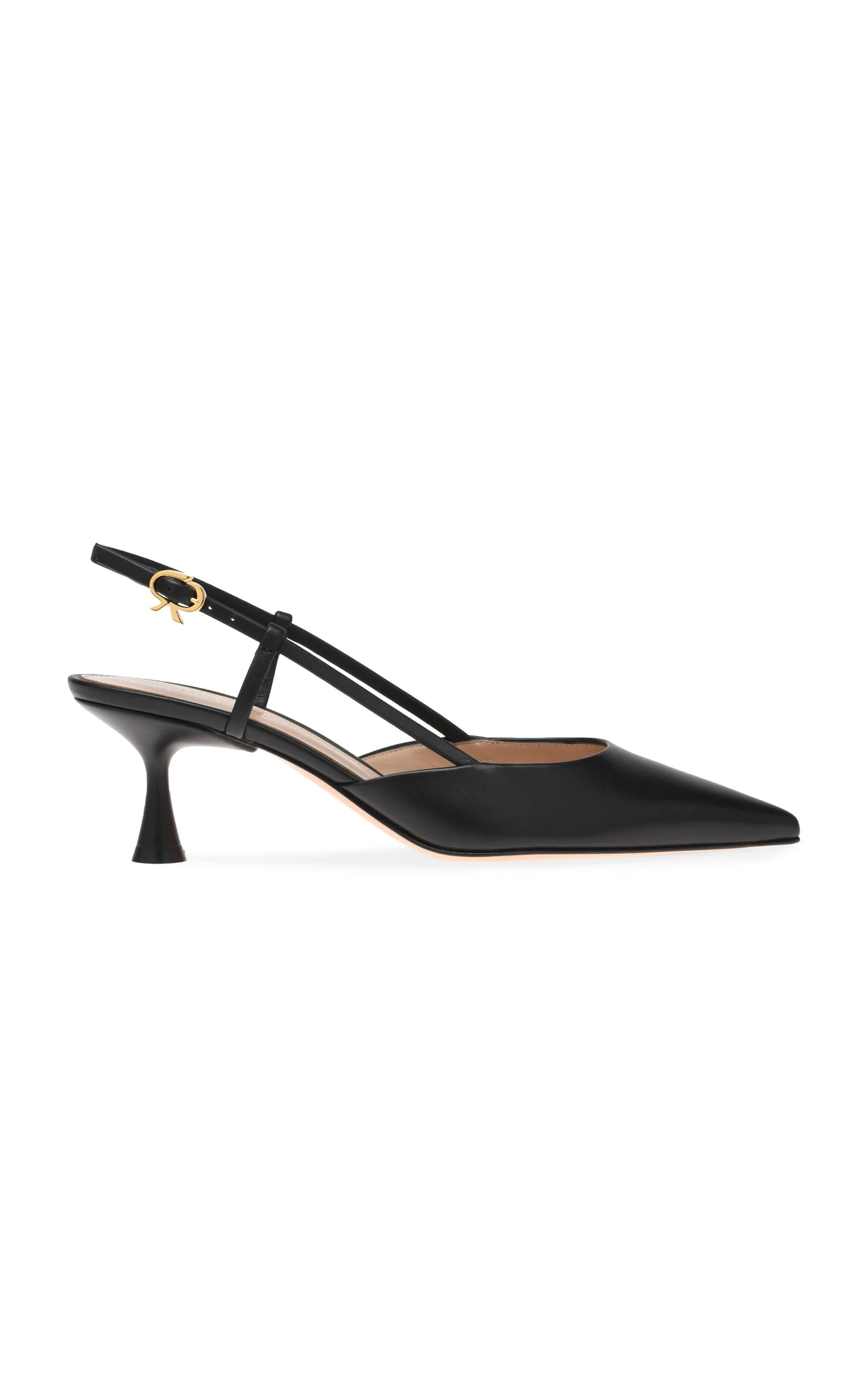 Son of Sergio, Gianvito Rossi continues the family legacy with his beautiful collection of glamorous footwear. Crafted to obsessive perfection, his shoes stem from the highest quality materials for luxurious comfort and longevity. Set on a 55mm flare kitten heel, Ascent is a pointed-toe slingback. The iconic Ribbon buckle in gold metal, signature of the brand, elegantly enriches the ankle strap. Handmade in Italy. PRODUCT DETAILS - Heel measures approximately 55mm / 2" - Buckle fastening - Composition: 100% calf leather - Made in Italy SIZE & FIT - Fits small to size