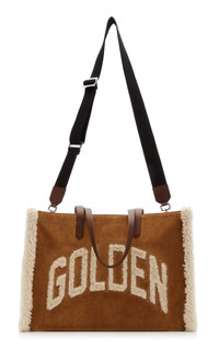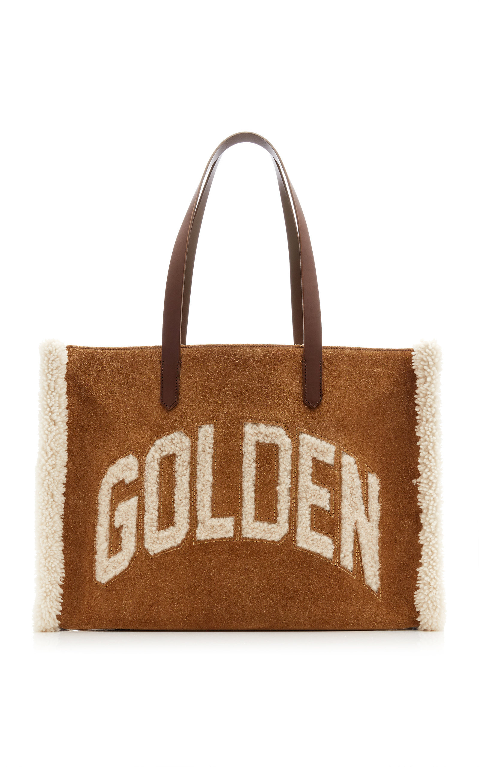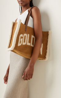 Alessandro Gallo and Francesa Rinaldo are the husband and wife duo behind Golden Goose, fusing fine Italian craftsmanship with cool, contemporary style. Crafted from supple suede and trimmed with plush shearling, Golden Goose's 'California' tote is stitched with the word 'Golden' across the front. This spacious style opens to a pocketed, canvas-lined interior that will easily hold your larger essentials. PRODUCT DETAILS - Open top - Composition: suede, shearling - Made in Italy SIZE & FIT - This item measures approximately 14.17 x 14.17 x 5.12"